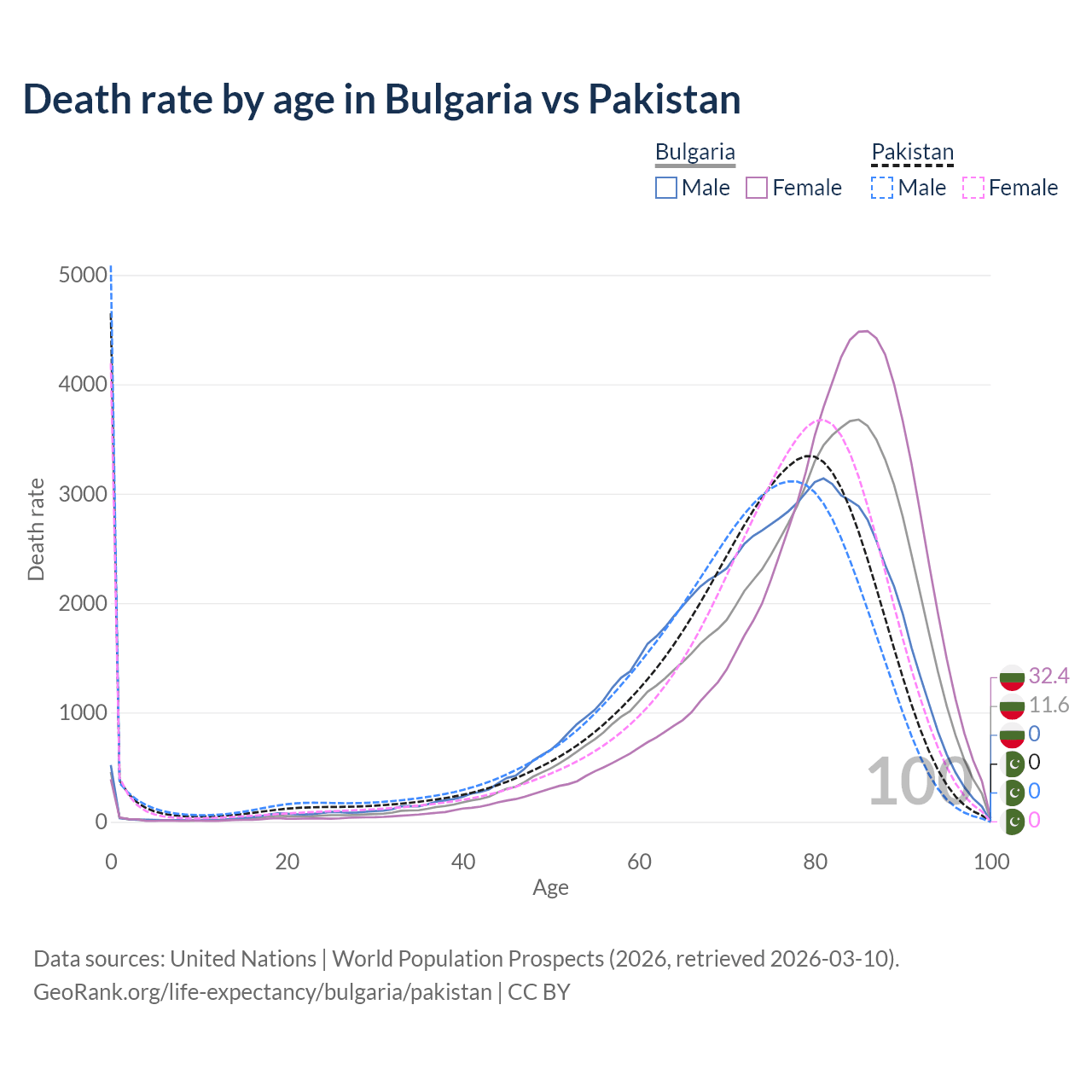 This life expectancy calculator shows the odds of living to 100, 95, 90, and below based on current age for both males and females in Bulgaria and Pakistan, along with mean and median age of death. The calculations are based on the 2026 life tables (actuarial tables) from the UN World Population Prospects.