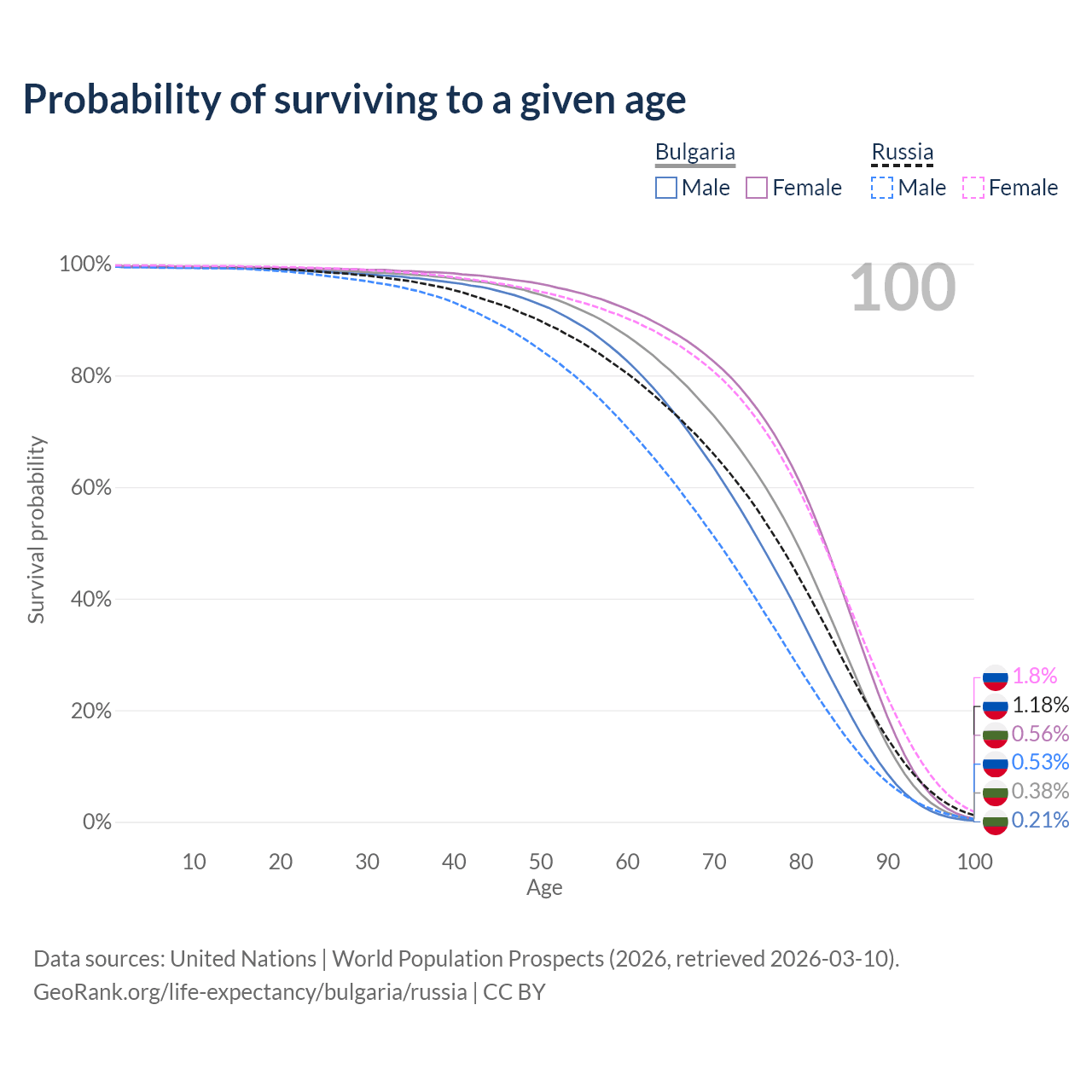 This life expectancy calculator shows the odds of living to 100, 95, 90, and below based on current age for both males and females in Bulgaria and Russia, along with mean and median age of death. The calculations are based on the 2026 life tables (actuarial tables) from the UN World Population Prospects.
