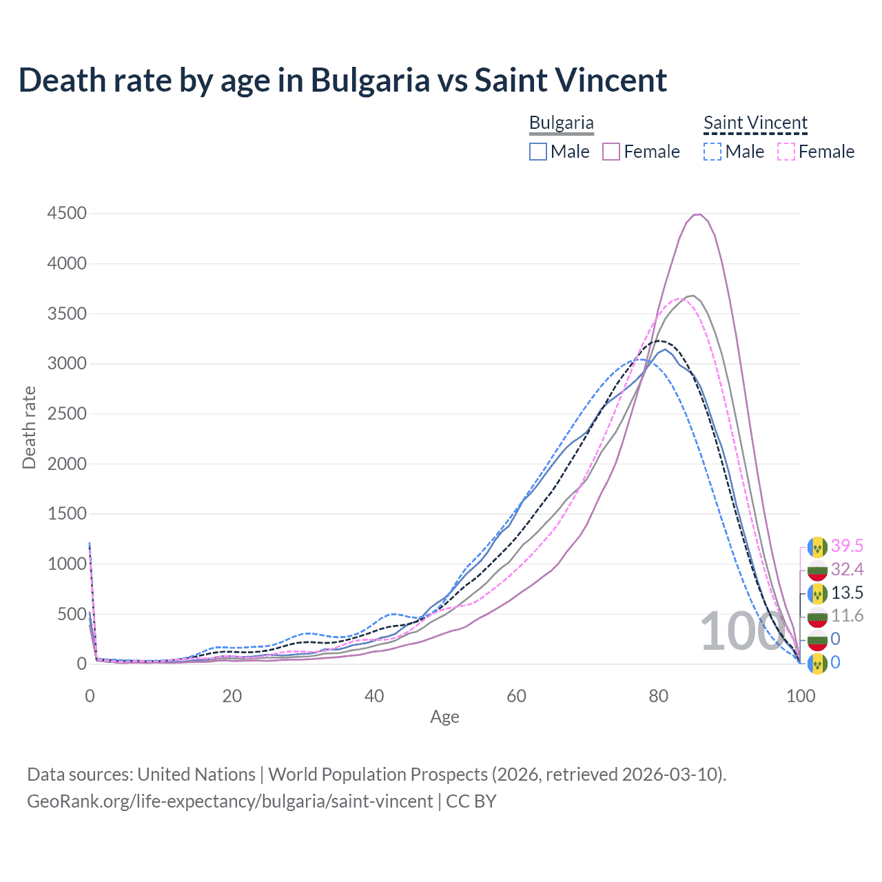 In Bulgaria, the most common age of death is 85, compared to 80 in Saint Vincent. The median age of death is 79.5 in Bulgaria and 75.6 in Saint Vincent, meaning only half of each cohort is expected to live past that age.