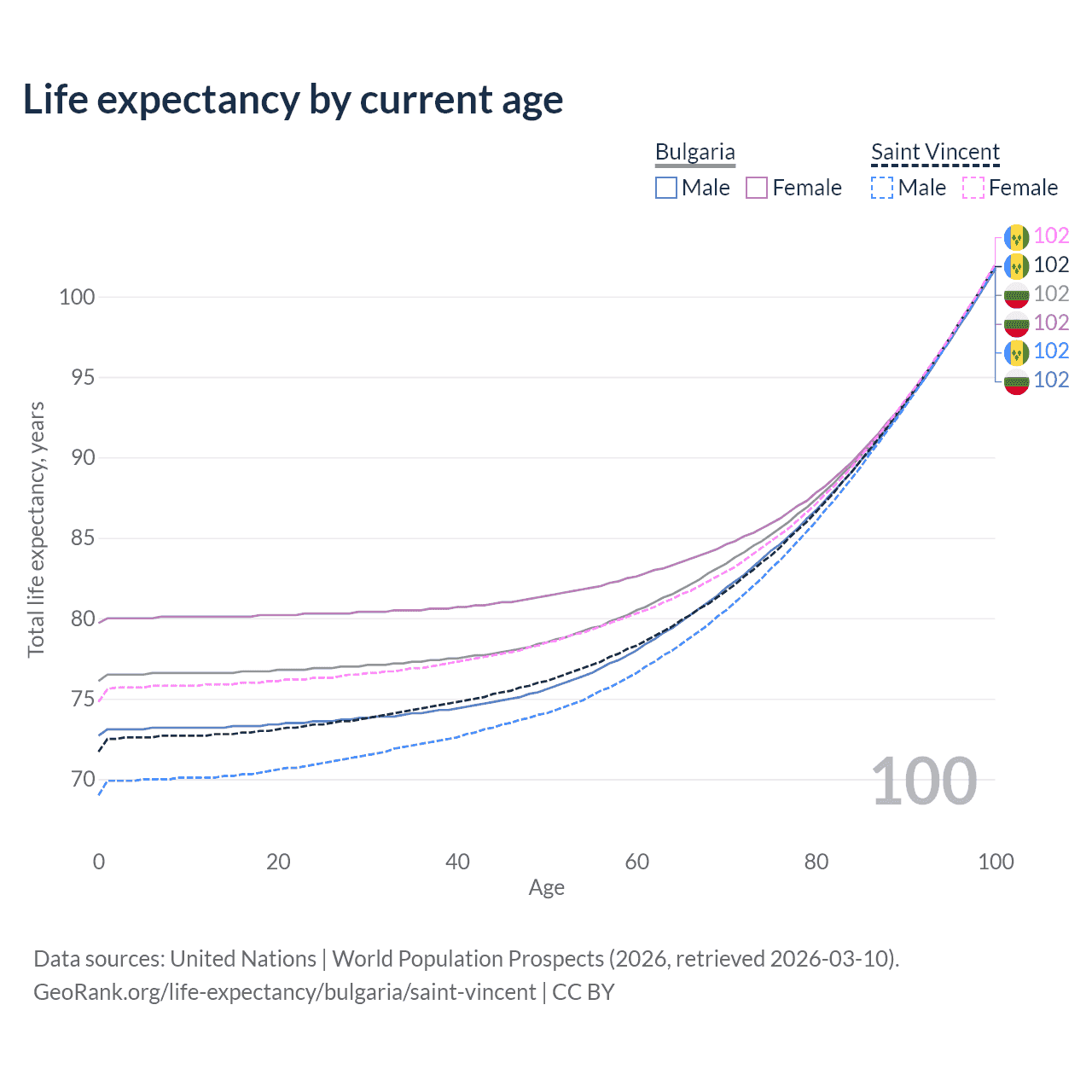 This life expectancy calculator shows the odds of living to 100, 95, 90, and below based on current age for both males and females in Bulgaria and Saint Vincent, along with mean and median age of death. The calculations are based on the 2026 life tables (actuarial tables) from the UN World Population Prospects.