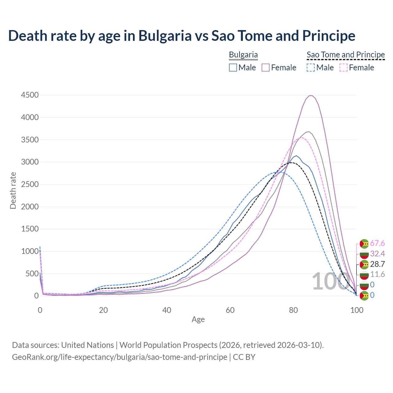 In Bulgaria, the most common age of death is 85, compared to 79 in Sao Tome and Principe. The median age of death is 79.5 in Bulgaria and 74.1 in Sao Tome and Principe, meaning only half of each cohort is expected to live past that age.