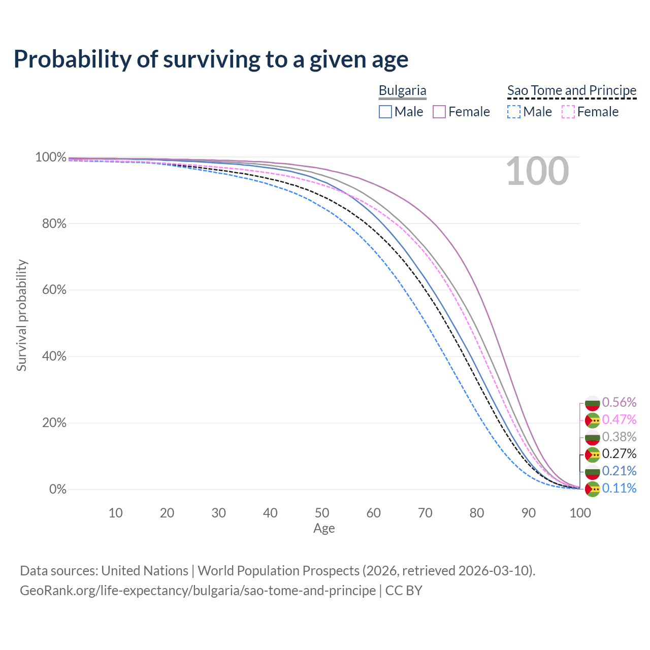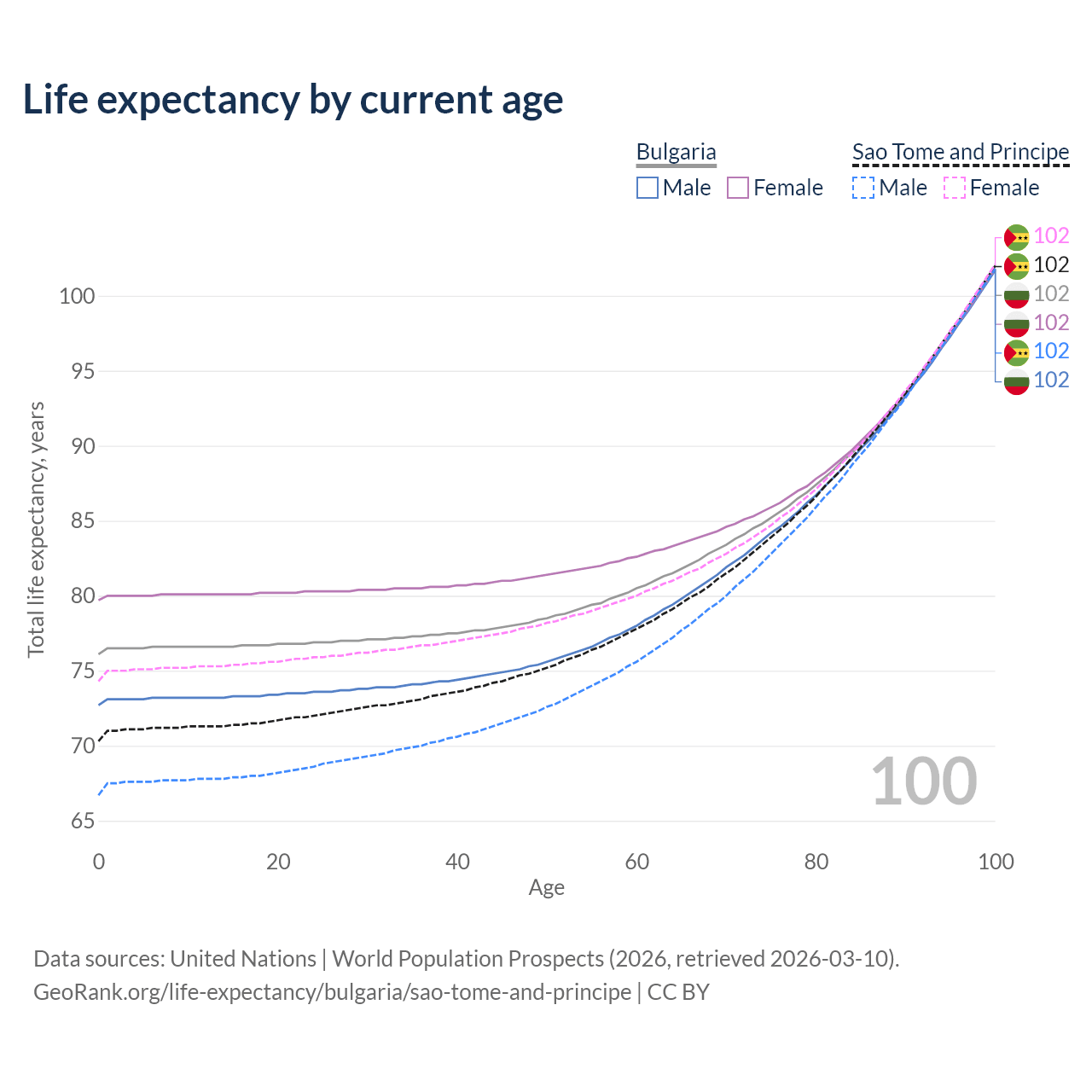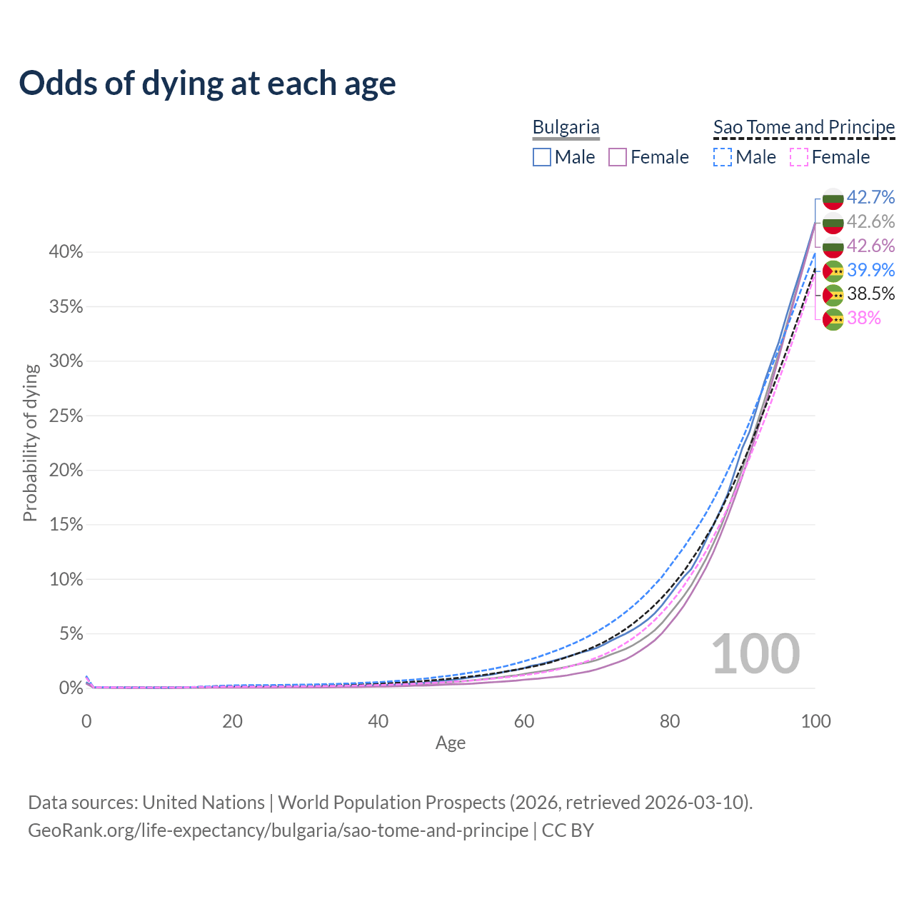 This life expectancy calculator shows the odds of living to 100, 95, 90, and below based on current age for both males and females in Bulgaria and Sao Tome and Principe, along with mean and median age of death. The calculations are based on the 2026 life tables (actuarial tables) from the UN World Population Prospects.
