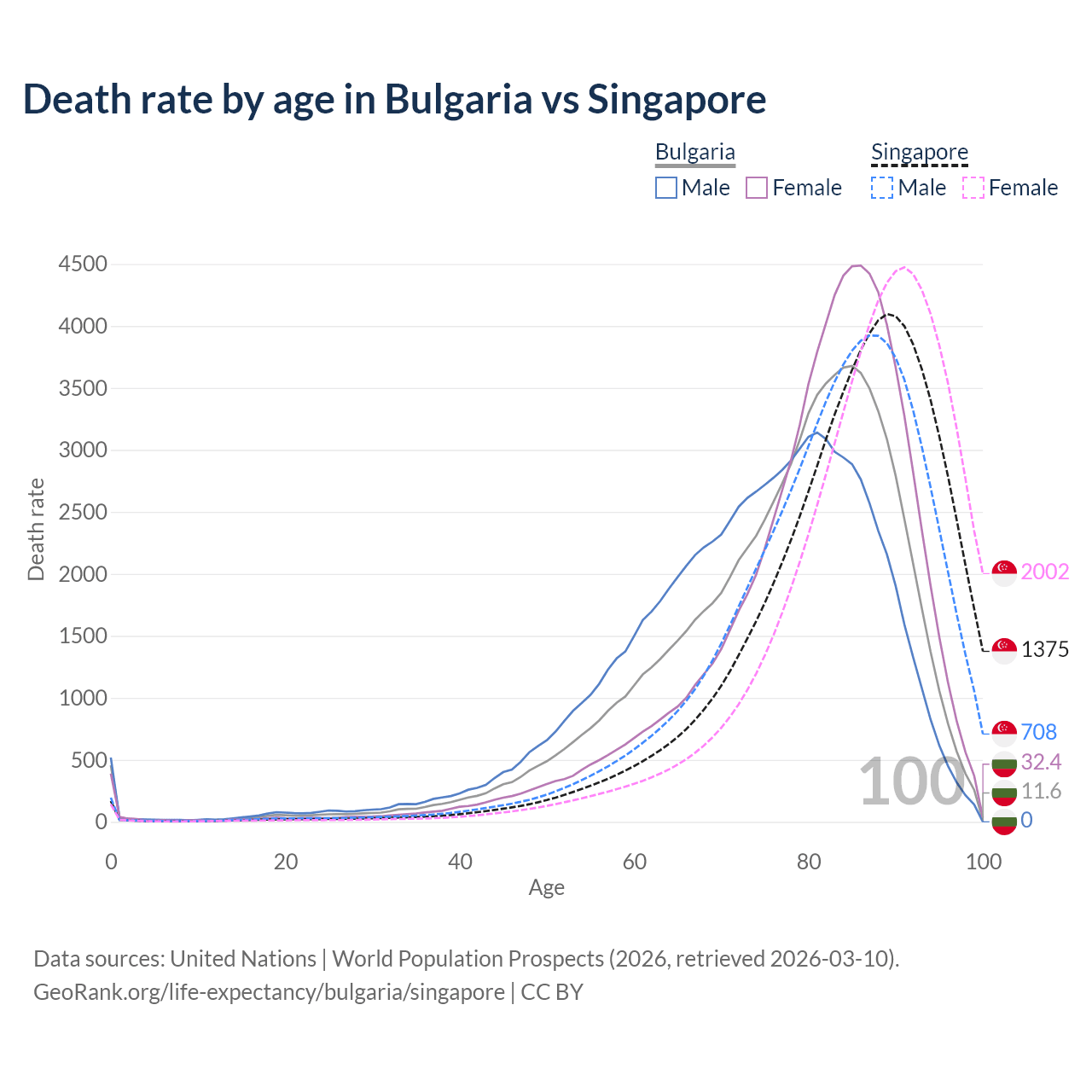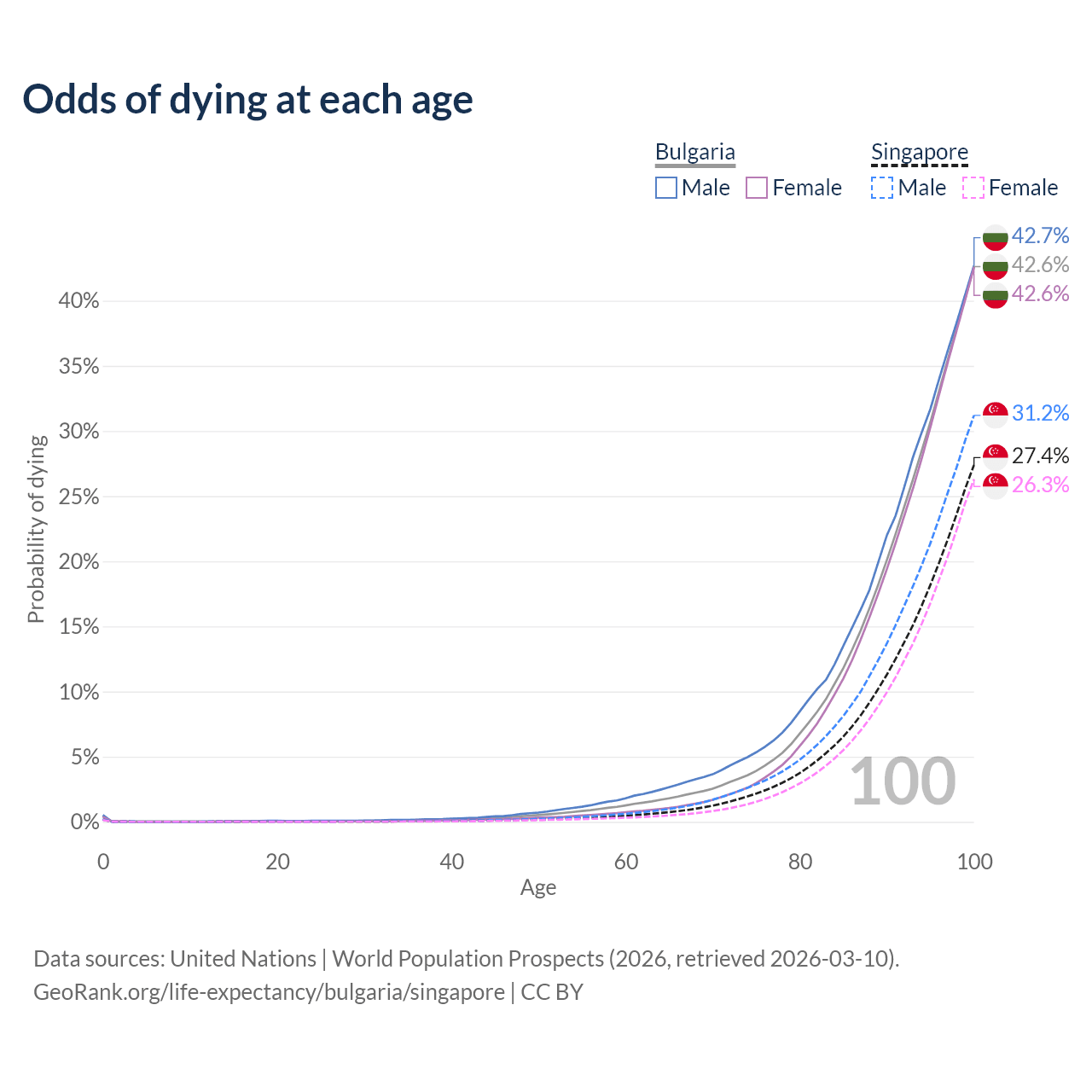 This life expectancy calculator shows the odds of living to 100, 95, 90, and below based on current age for both males and females in Bulgaria and Singapore, along with mean and median age of death. The calculations are based on the 2026 life tables (actuarial tables) from the UN World Population Prospects.