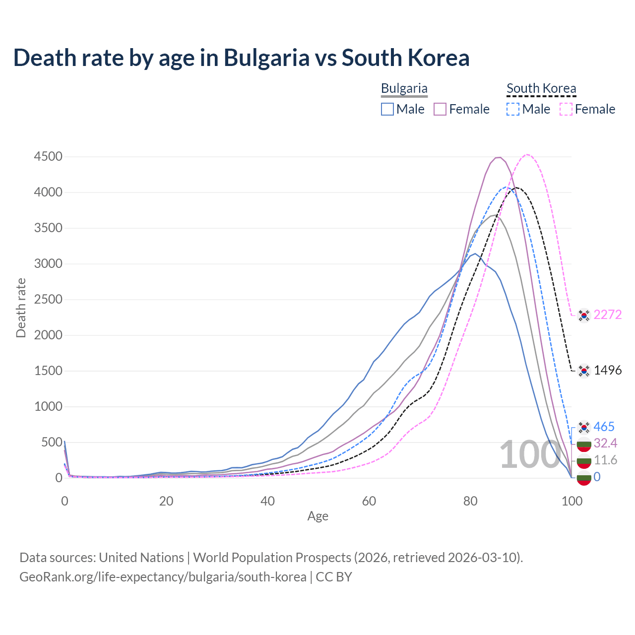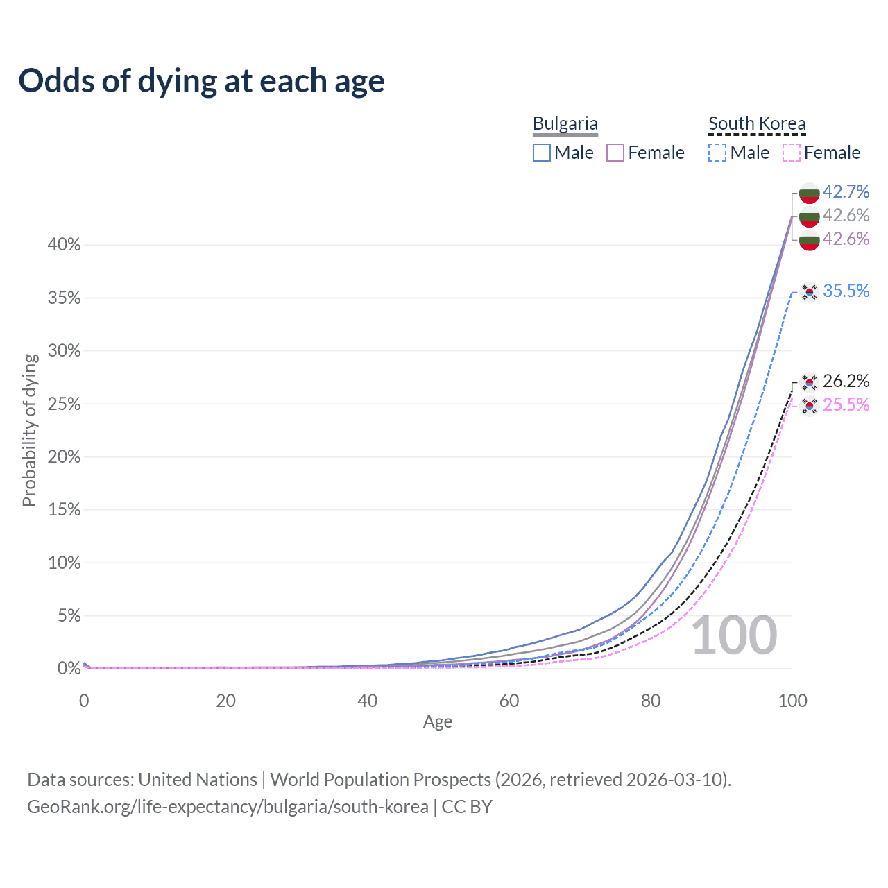 This life expectancy calculator shows the odds of living to 100, 95, 90, and below based on current age for both males and females in Bulgaria and South Korea, along with mean and median age of death. The calculations are based on the 2026 life tables (actuarial tables) from the UN World Population Prospects.