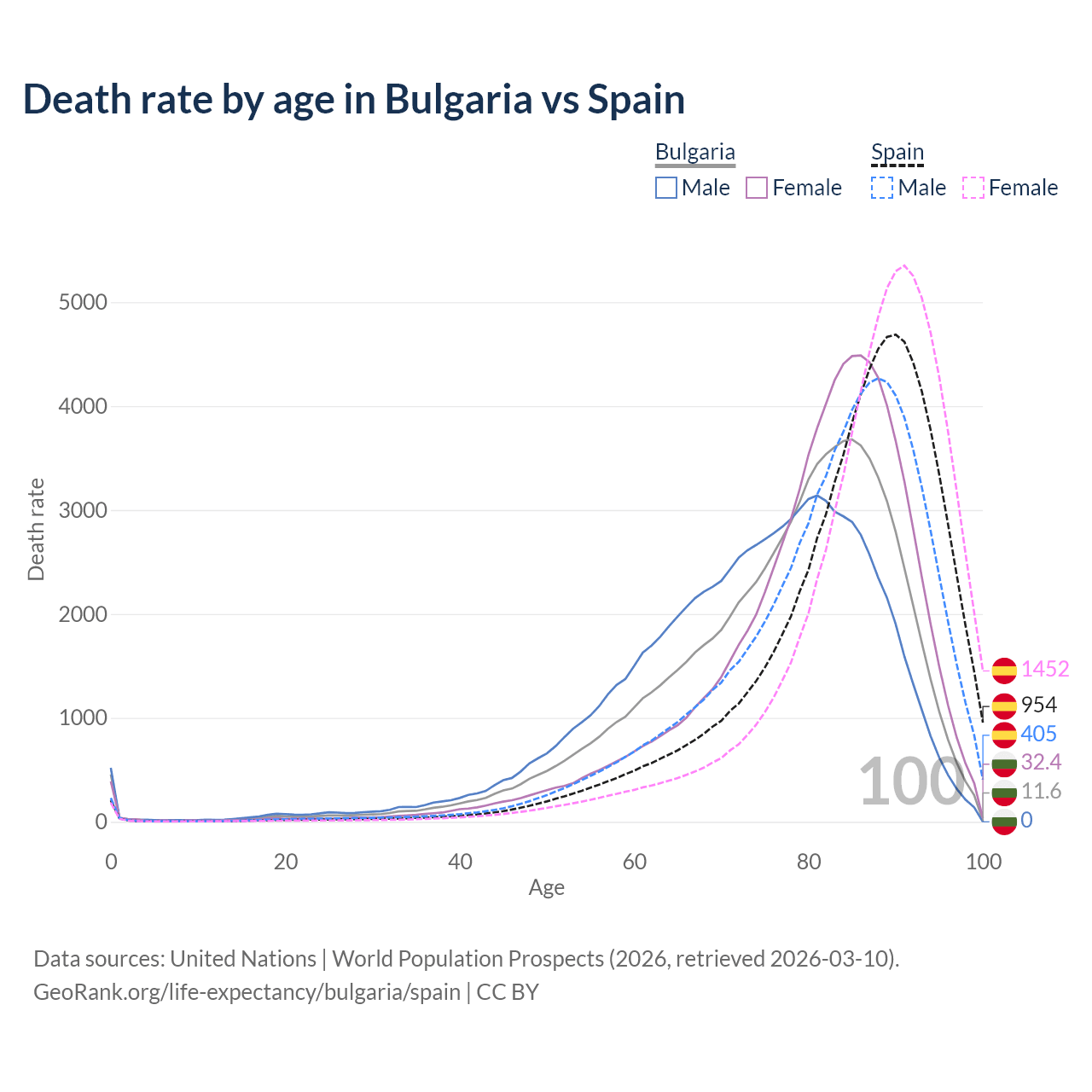 This life expectancy calculator shows the odds of living to 100, 95, 90, and below based on current age for both males and females in Bulgaria and Spain, along with mean and median age of death. The calculations are based on the 2026 life tables (actuarial tables) from the UN World Population Prospects.
