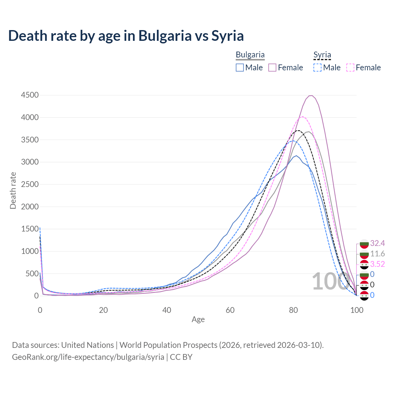 This life expectancy calculator shows the odds of living to 100, 95, 90, and below based on current age for both males and females in Bulgaria and Syria, along with mean and median age of death. The calculations are based on the 2026 life tables (actuarial tables) from the UN World Population Prospects.