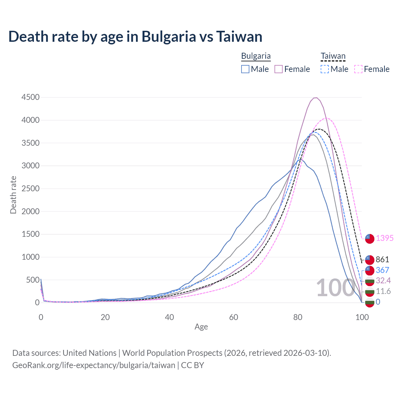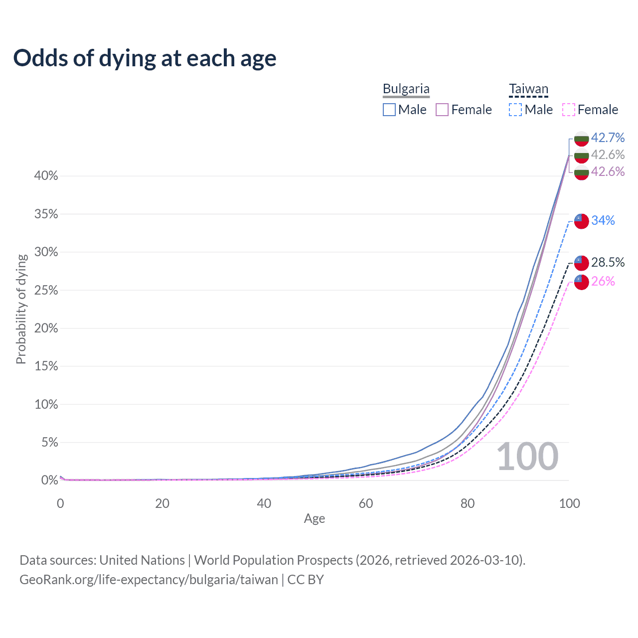 This life expectancy calculator shows the odds of living to 100, 95, 90, and below based on current age for both males and females in Bulgaria and Taiwan, along with mean and median age of death. The calculations are based on the 2026 life tables (actuarial tables) from the UN World Population Prospects.