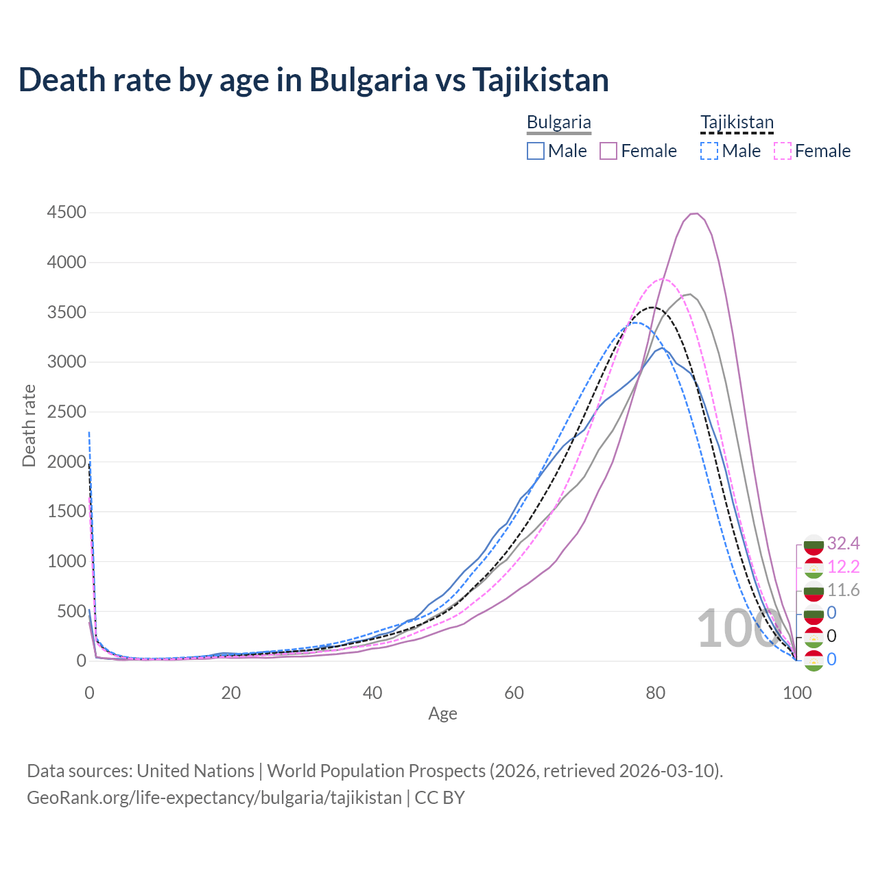 This life expectancy calculator shows the odds of living to 100, 95, 90, and below based on current age for both males and females in Bulgaria and Tajikistan, along with mean and median age of death. The calculations are based on the 2026 life tables (actuarial tables) from the UN World Population Prospects.