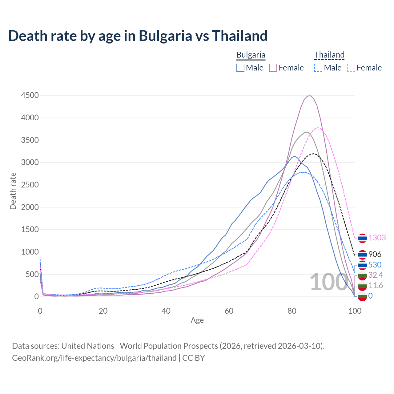 In Bulgaria, the most common age of death is 85, compared to 87 in Thailand. The median age of death is 79.5 in Bulgaria and 81.8 in Thailand, meaning only half of each cohort is expected to live past that age.