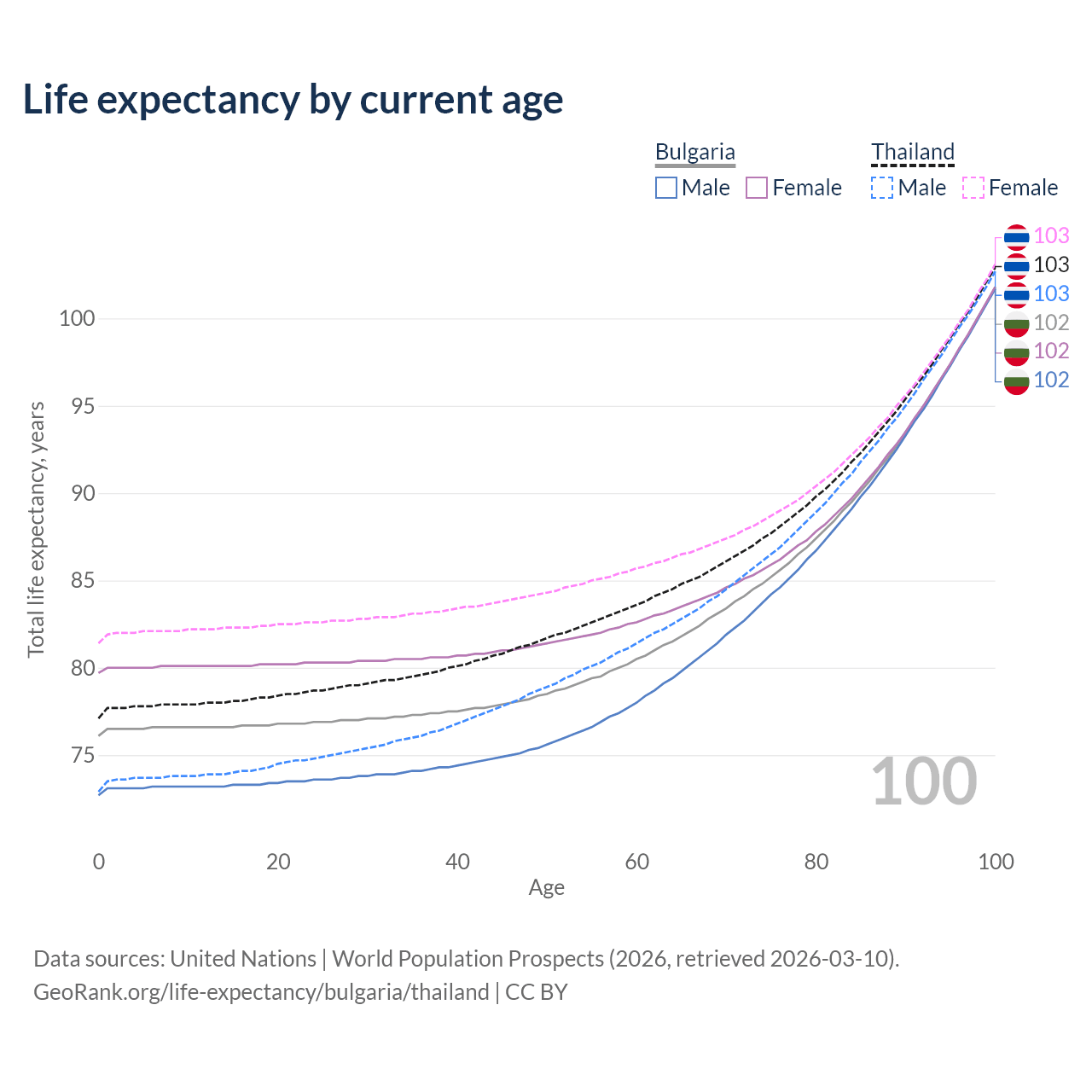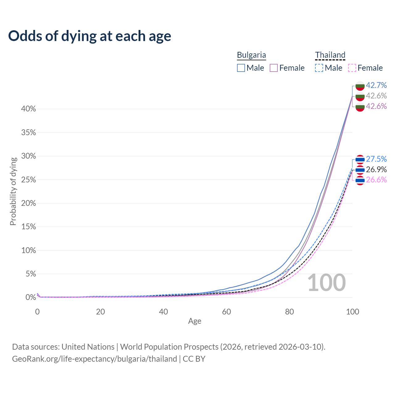 This life expectancy calculator shows the odds of living to 100, 95, 90, and below based on current age for both males and females in Bulgaria and Thailand, along with mean and median age of death. The calculations are based on the 2026 life tables (actuarial tables) from the UN World Population Prospects.