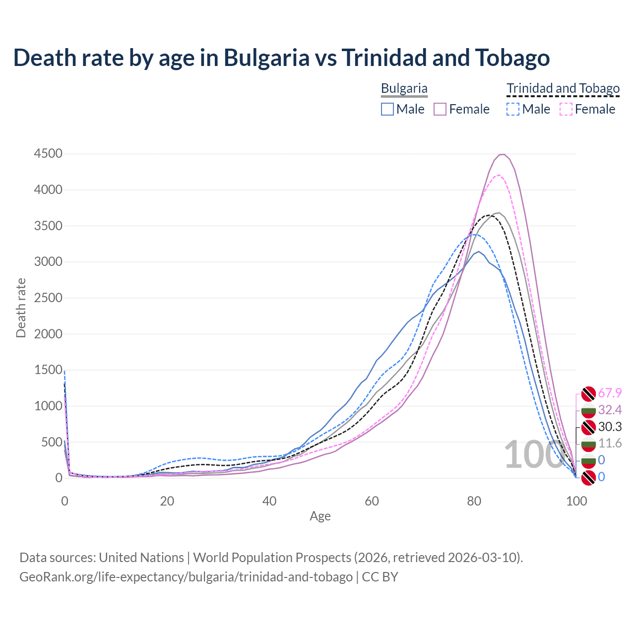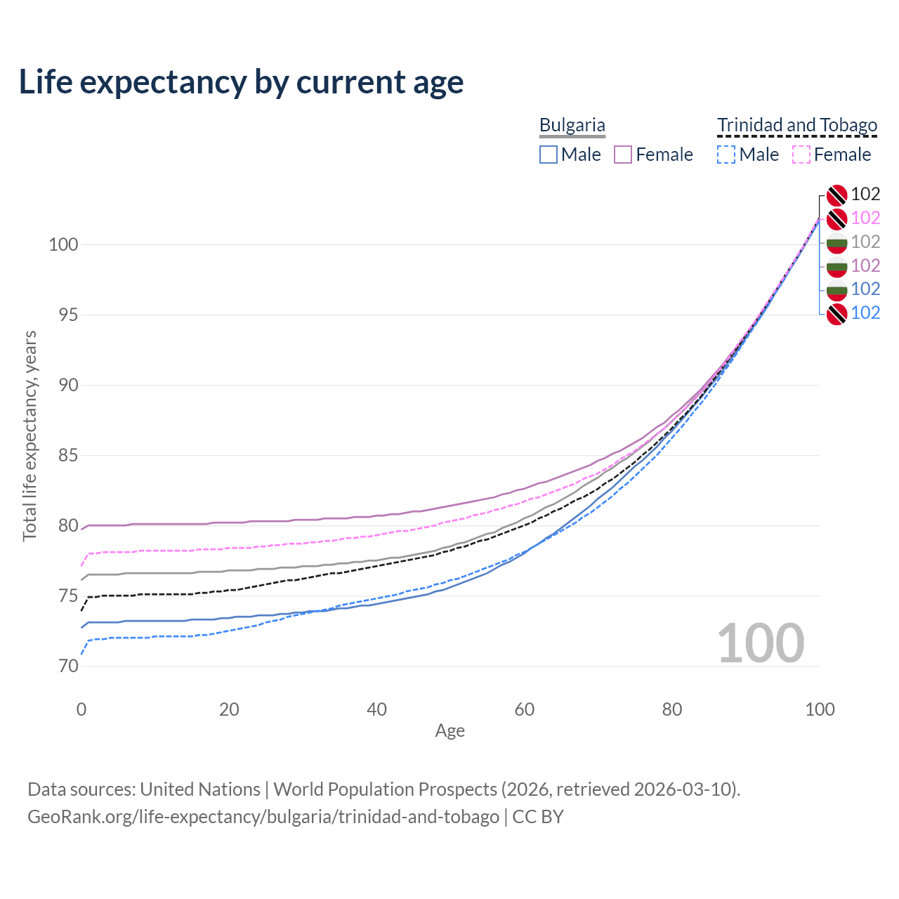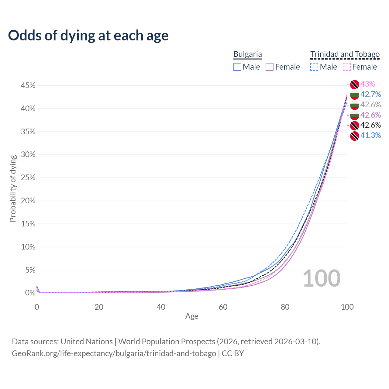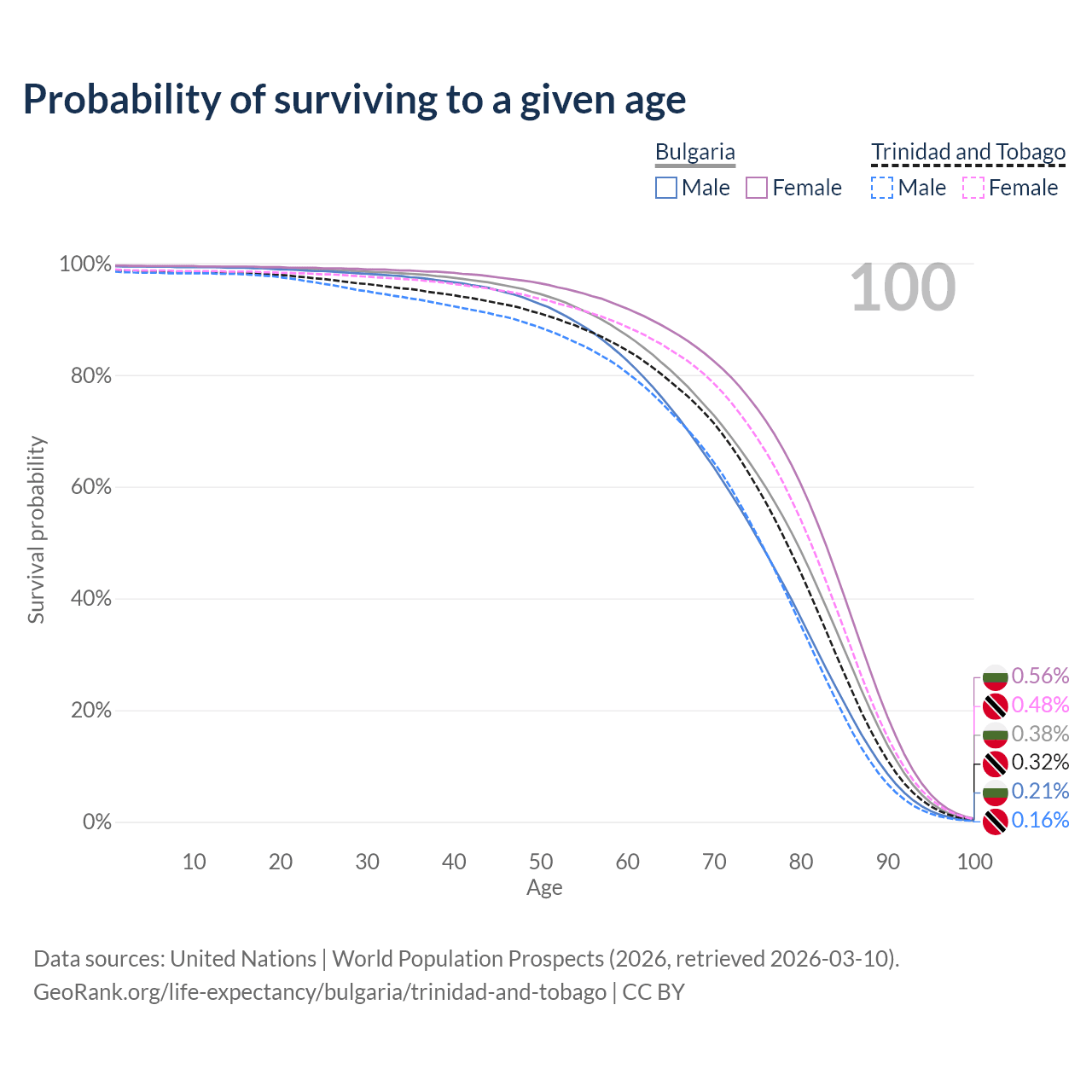 This life expectancy calculator shows the odds of living to 100, 95, 90, and below based on current age for both males and females in Bulgaria and Trinidad and Tobago, along with mean and median age of death. The calculations are based on the 2026 life tables (actuarial tables) from the UN World Population Prospects.