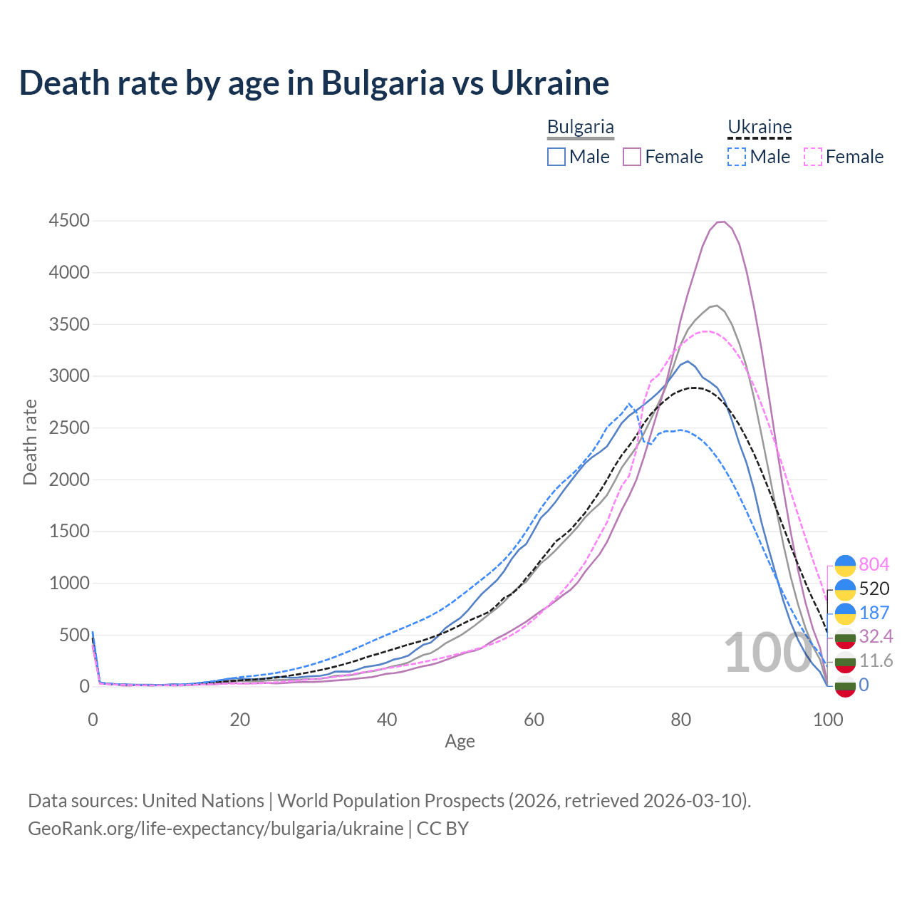 In Bulgaria, the most common age of death is 85, compared to 82 in Ukraine. The median age of death is 79.5 in Bulgaria and 78 in Ukraine, meaning only half of each cohort is expected to live past that age.