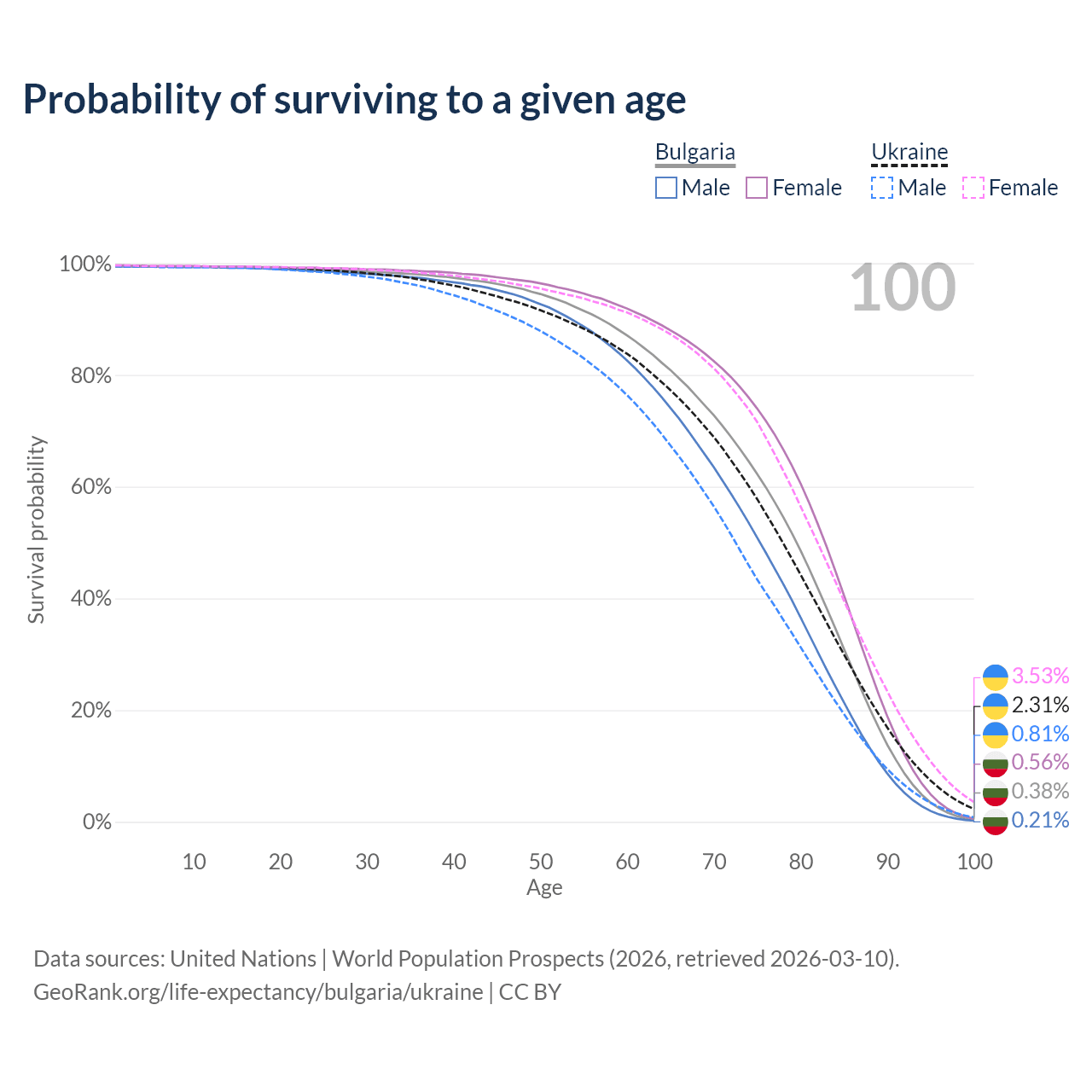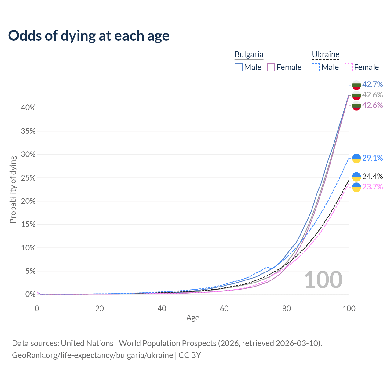 This life expectancy calculator shows the odds of living to 100, 95, 90, and below based on current age for both males and females in Bulgaria and Ukraine, along with mean and median age of death. The calculations are based on the 2026 life tables (actuarial tables) from the UN World Population Prospects.