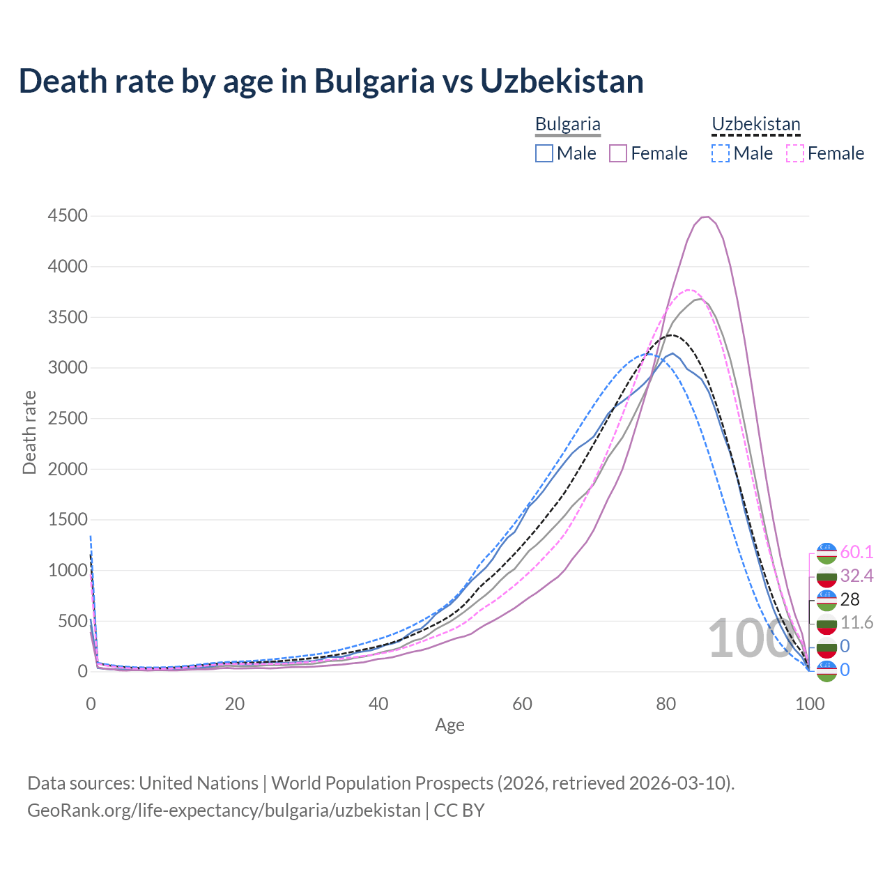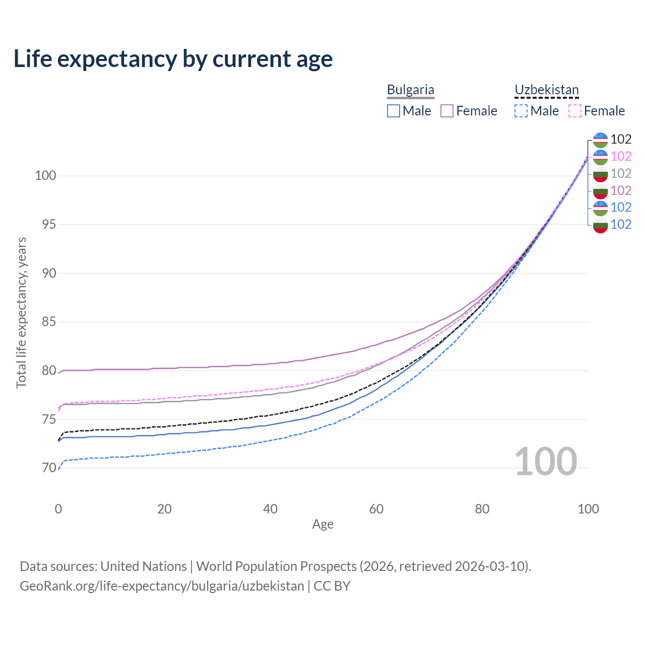 This life expectancy calculator shows the odds of living to 100, 95, 90, and below based on current age for both males and females in Bulgaria and Uzbekistan, along with mean and median age of death. The calculations are based on the 2026 life tables (actuarial tables) from the UN World Population Prospects.