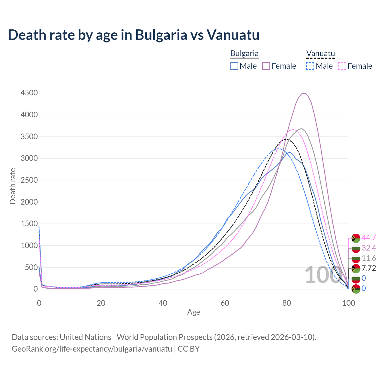 In Bulgaria, the most common age of death is 85, compared to 80 in Vanuatu. The median age of death is 79.5 in Bulgaria and 75.9 in Vanuatu, meaning only half of each cohort is expected to live past that age.