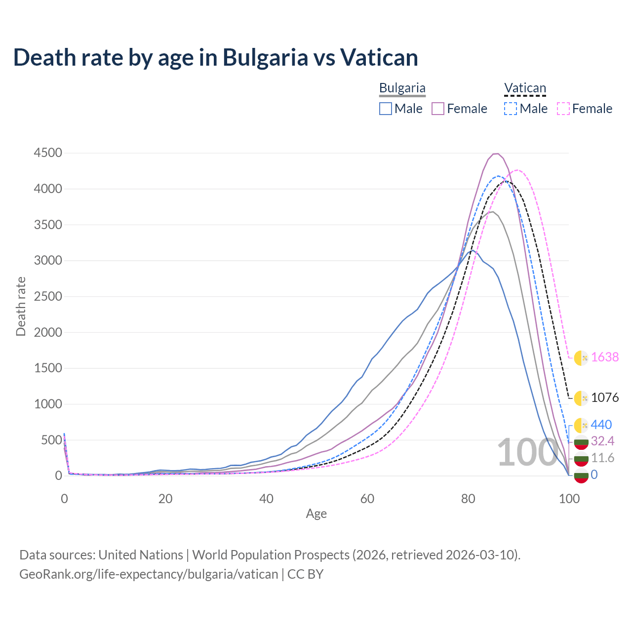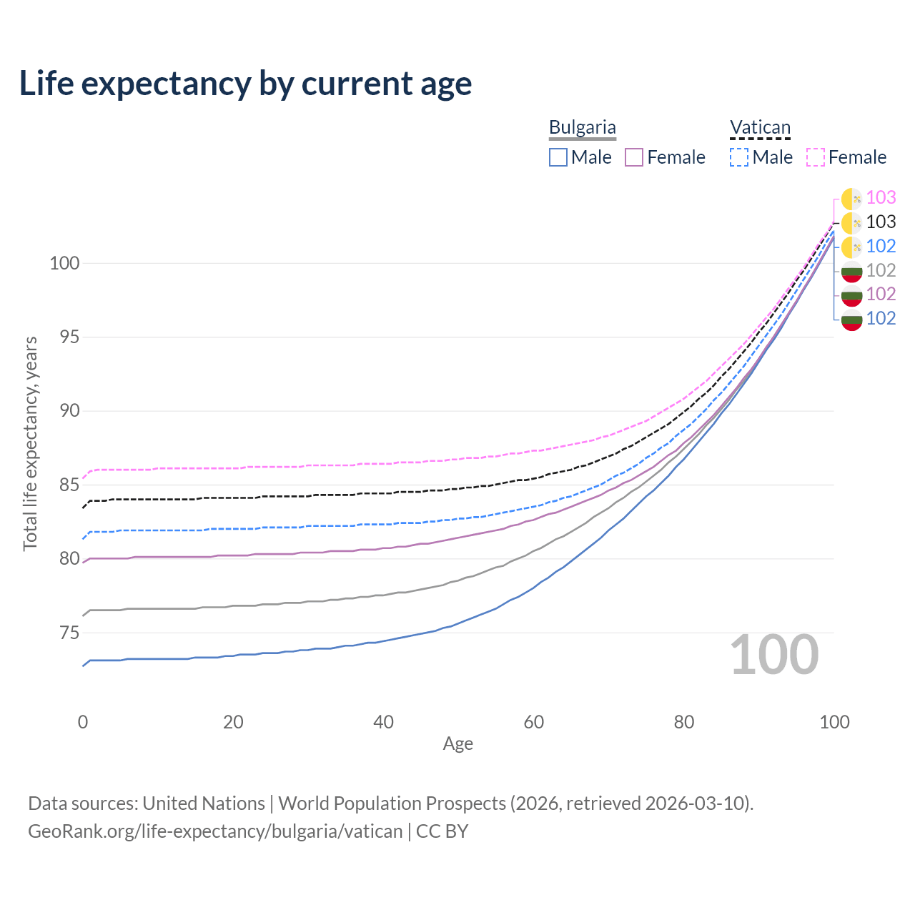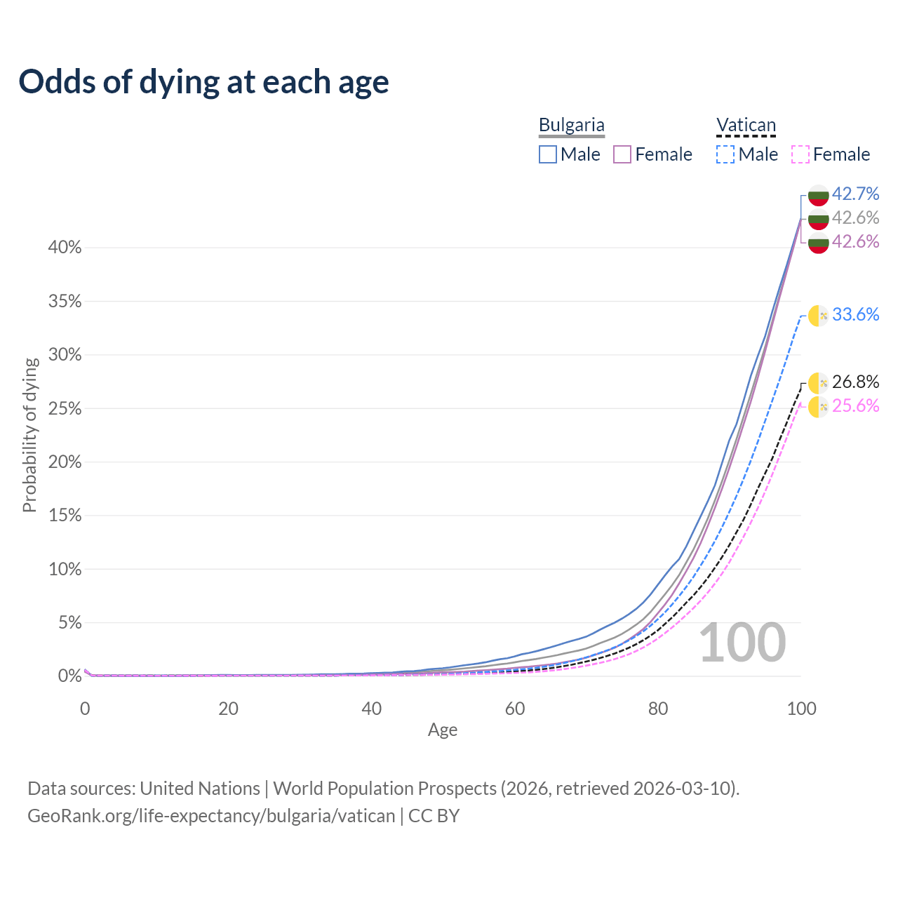 This life expectancy calculator shows the odds of living to 100, 95, 90, and below based on current age for both males and females in Bulgaria and the Vatican, along with mean and median age of death. The calculations are based on the 2026 life tables (actuarial tables) from the UN World Population Prospects.