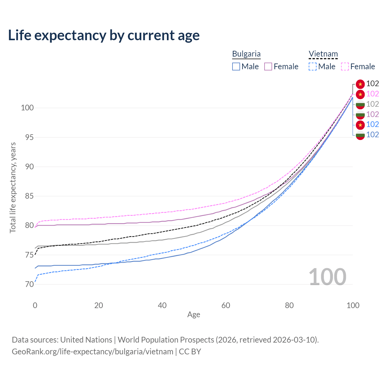 This life expectancy calculator shows the odds of living to 100, 95, 90, and below based on current age for both males and females in Bulgaria and Vietnam, along with mean and median age of death. The calculations are based on the 2026 life tables (actuarial tables) from the UN World Population Prospects.