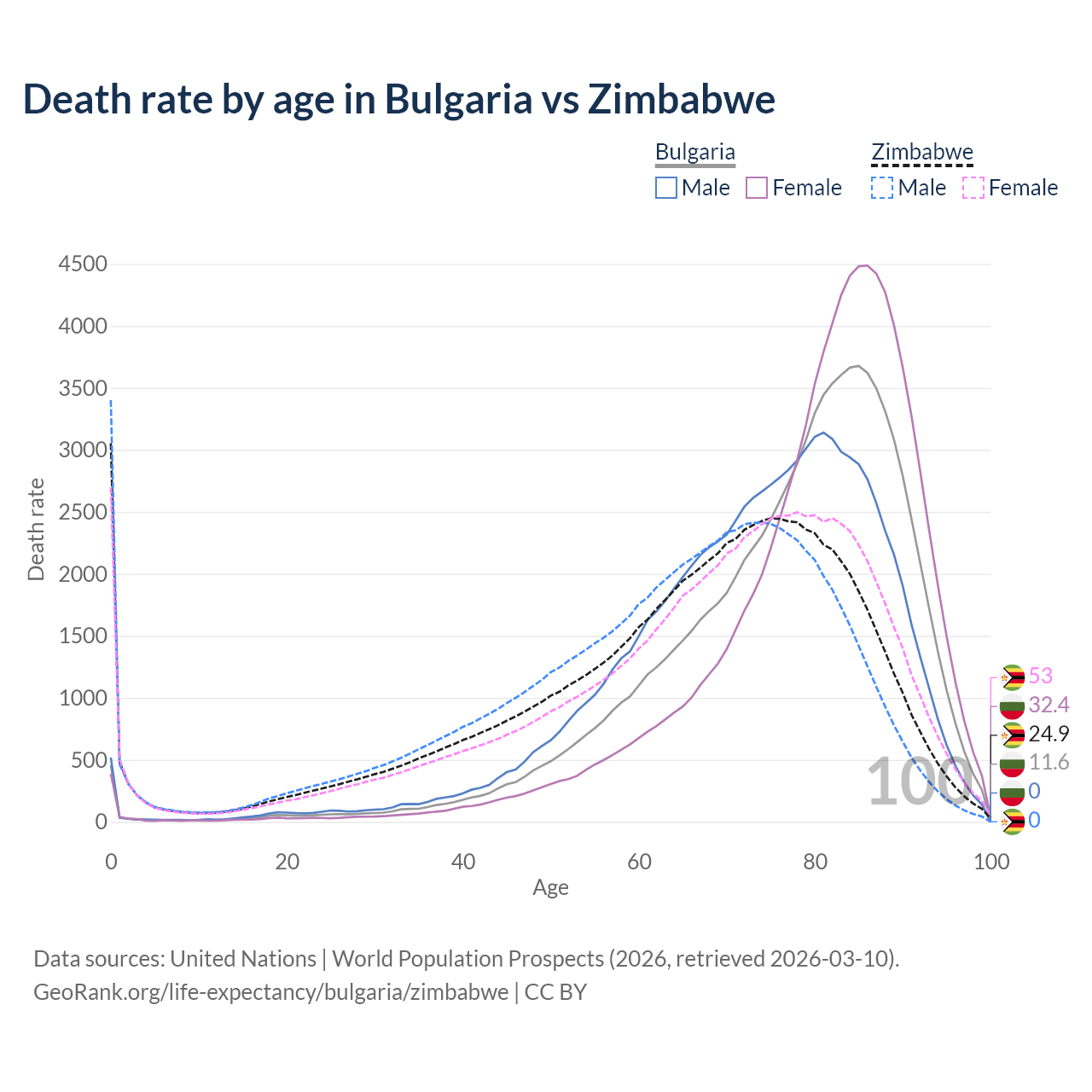 In Bulgaria, the most common age of death is 85, compared to 0 in Zimbabwe. The median age of death is 79.5 in Bulgaria and 68.8 in Zimbabwe, meaning only half of each cohort is expected to live past that age.