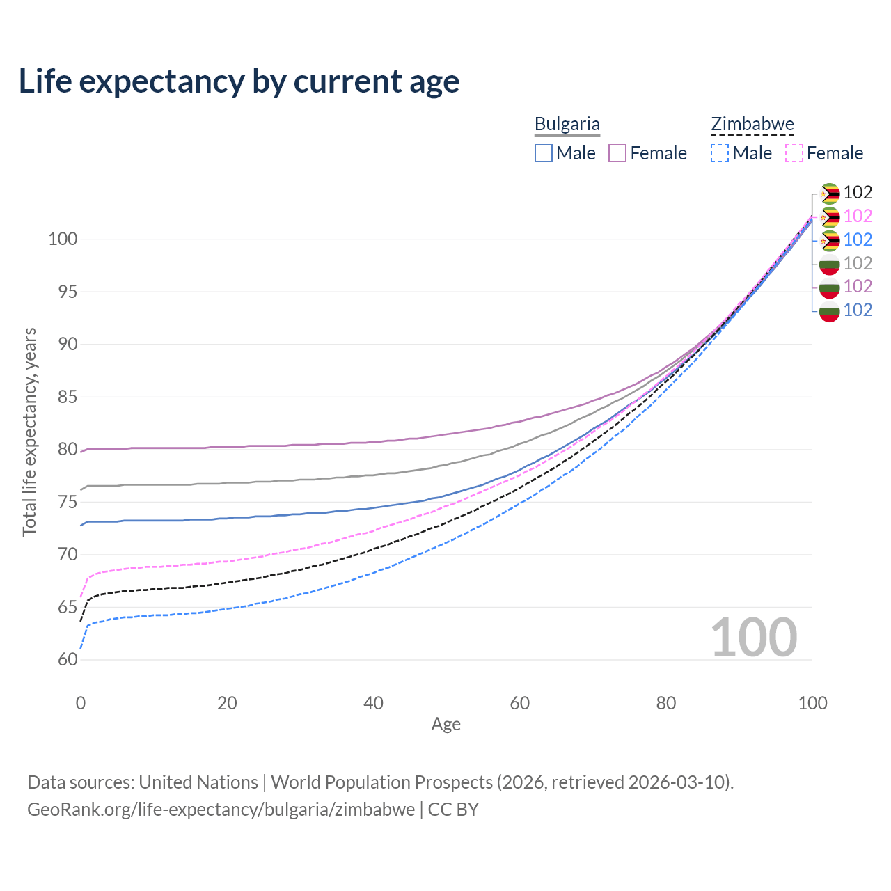 This life expectancy calculator shows the odds of living to 100, 95, 90, and below based on current age for both males and females in Bulgaria and Zimbabwe, along with mean and median age of death. The calculations are based on the 2026 life tables (actuarial tables) from the UN World Population Prospects.