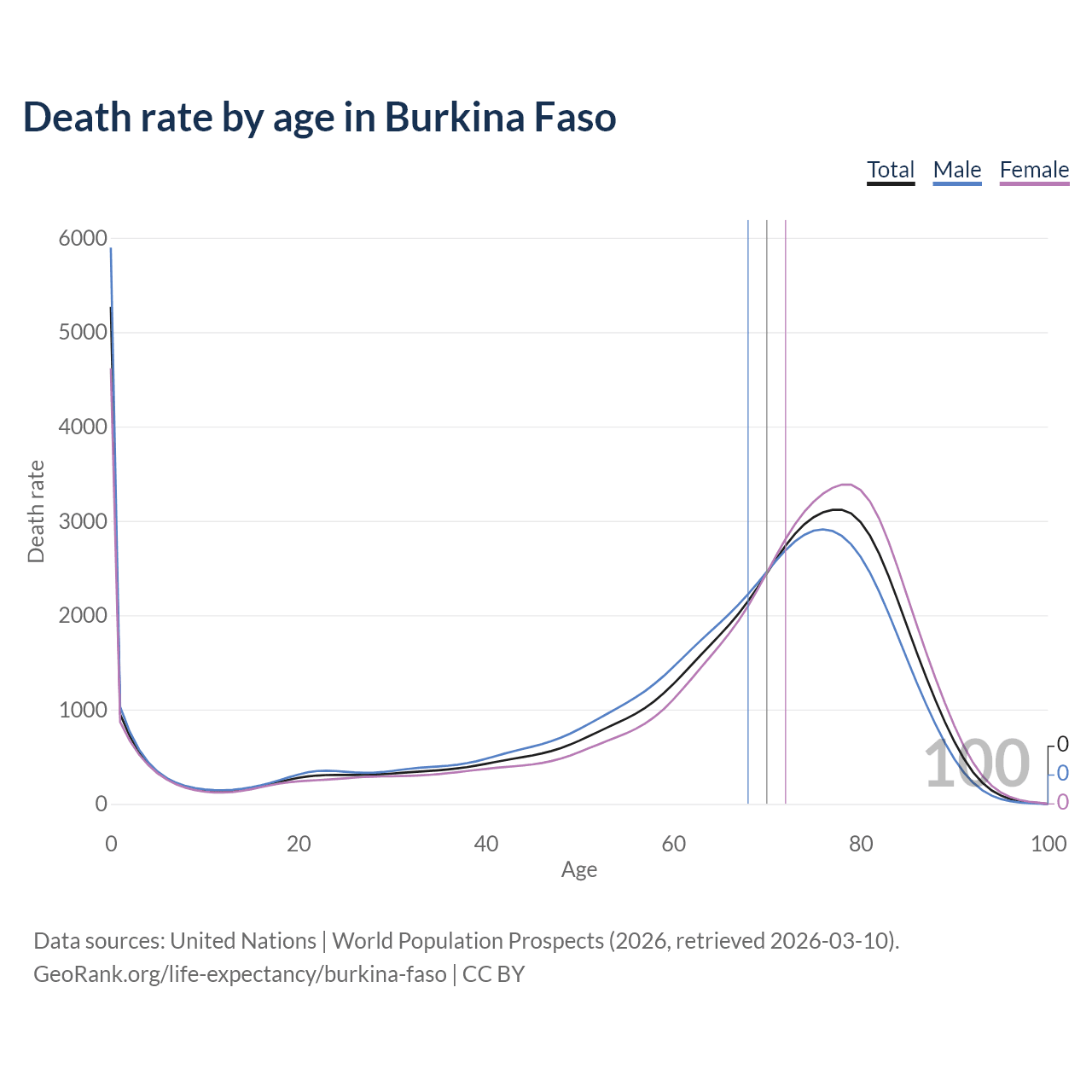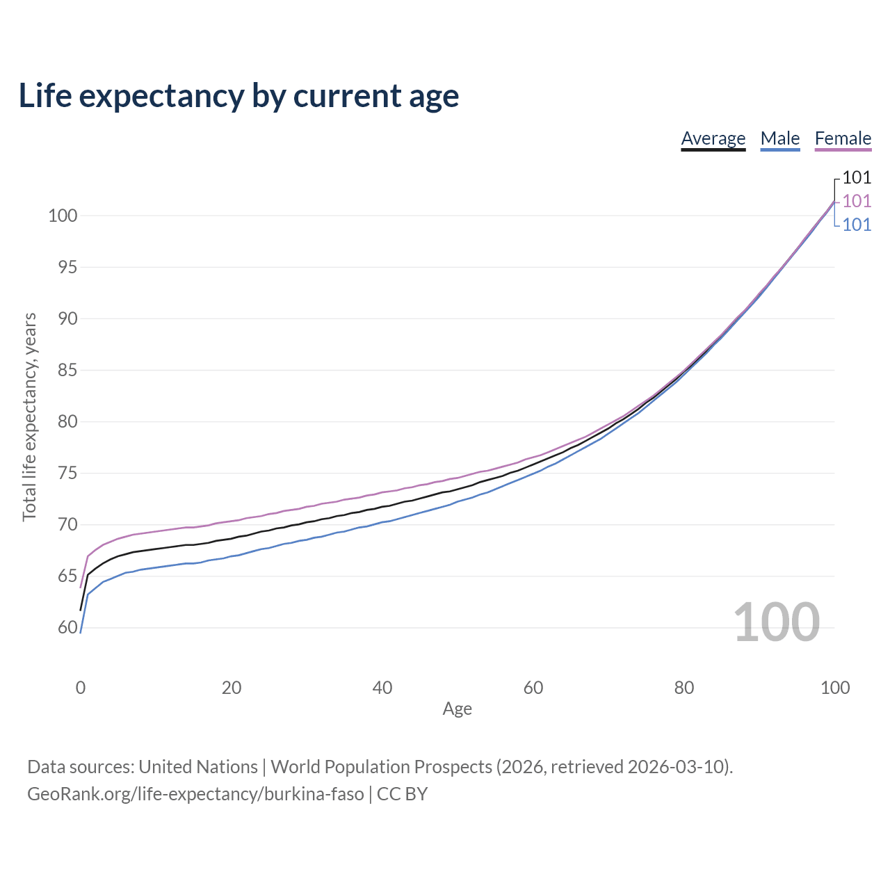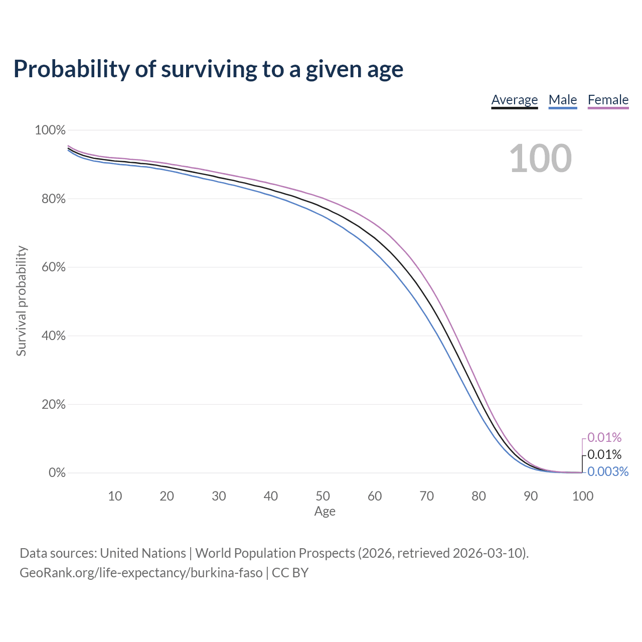 This life expectancy calculator shows the odds of living to 100, 95, 90, and below based on current age for both males and females in Burkina Faso, along with mean and median age of death. The calculations are based on the 2026 life tables (actuarial tables) from the UN World Population Prospects.