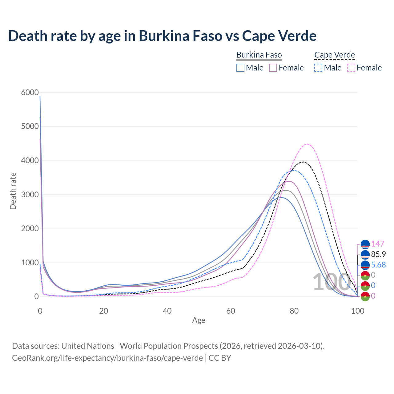 In Burkina Faso, the most common age of death is 0, compared to 83 in Cape Verde. The median age of death is 70.4 in Burkina Faso and 80.1 in Cape Verde, meaning only half of each cohort is expected to live past that age.