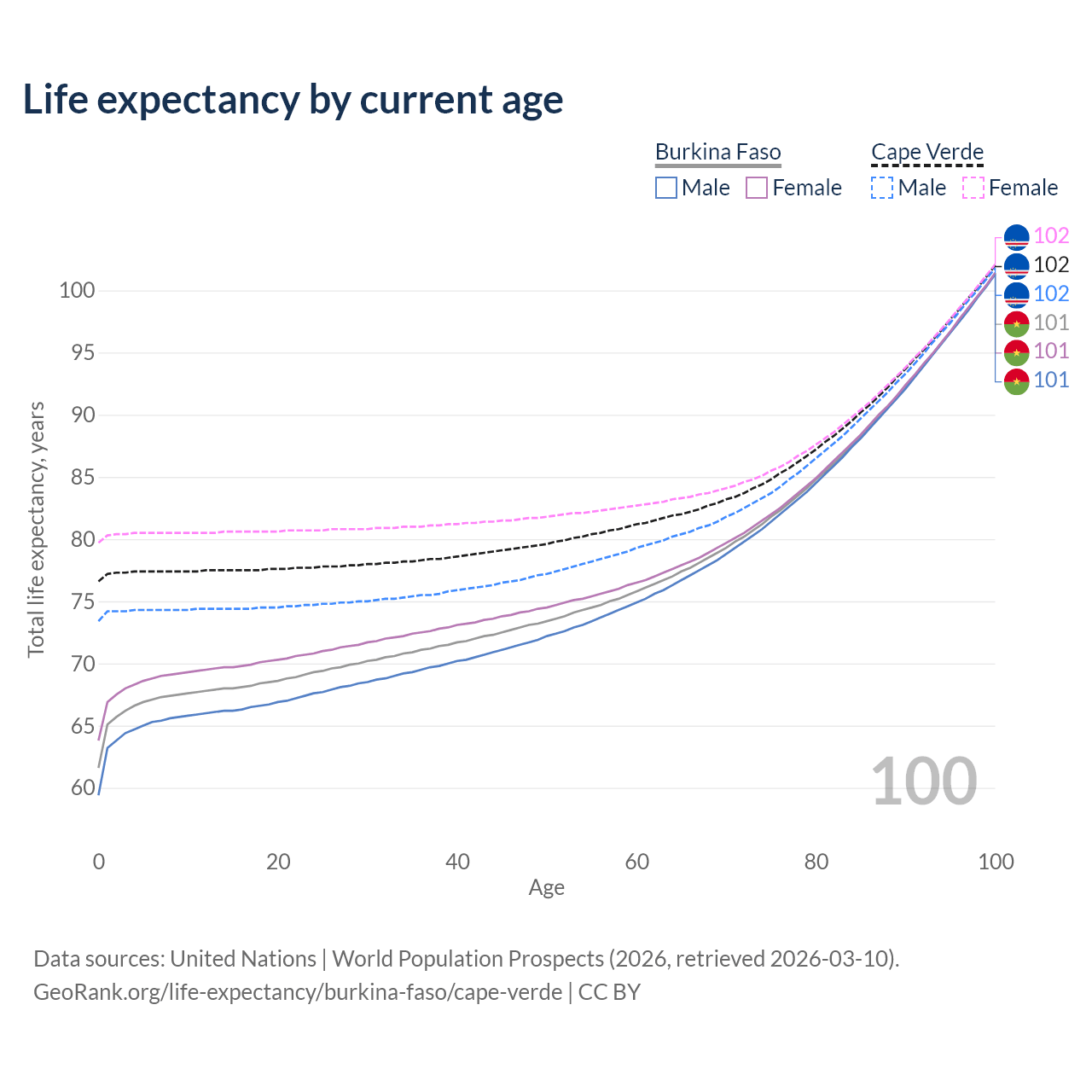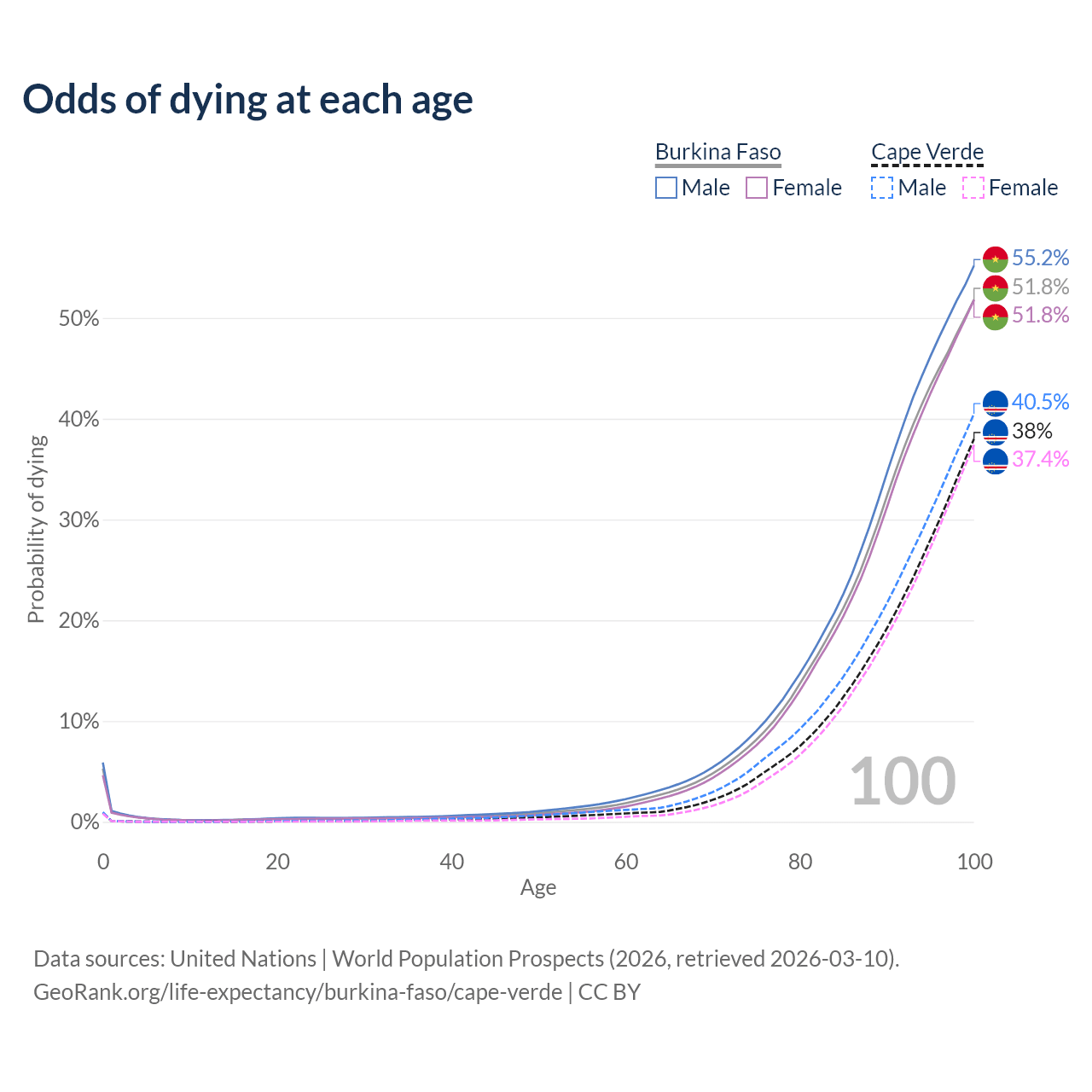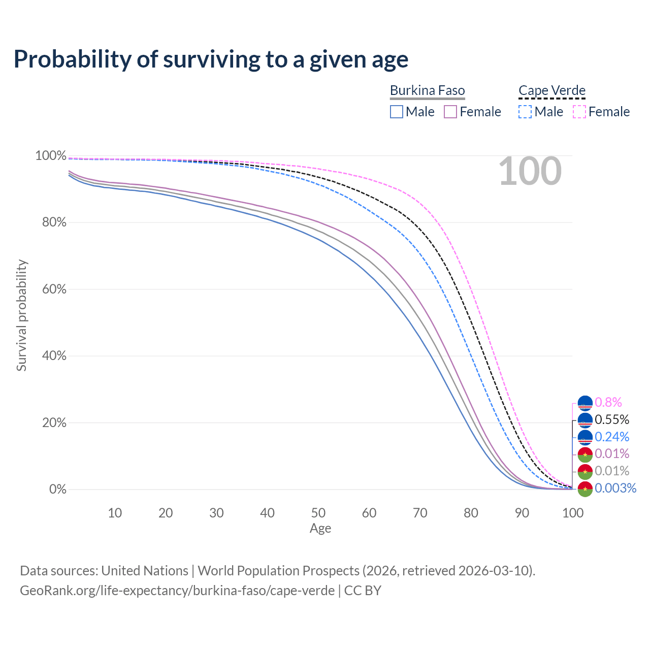 This life expectancy calculator shows the odds of living to 100, 95, 90, and below based on current age for both males and females in Burkina Faso and Cape Verde, along with mean and median age of death. The calculations are based on the 2026 life tables (actuarial tables) from the UN World Population Prospects.