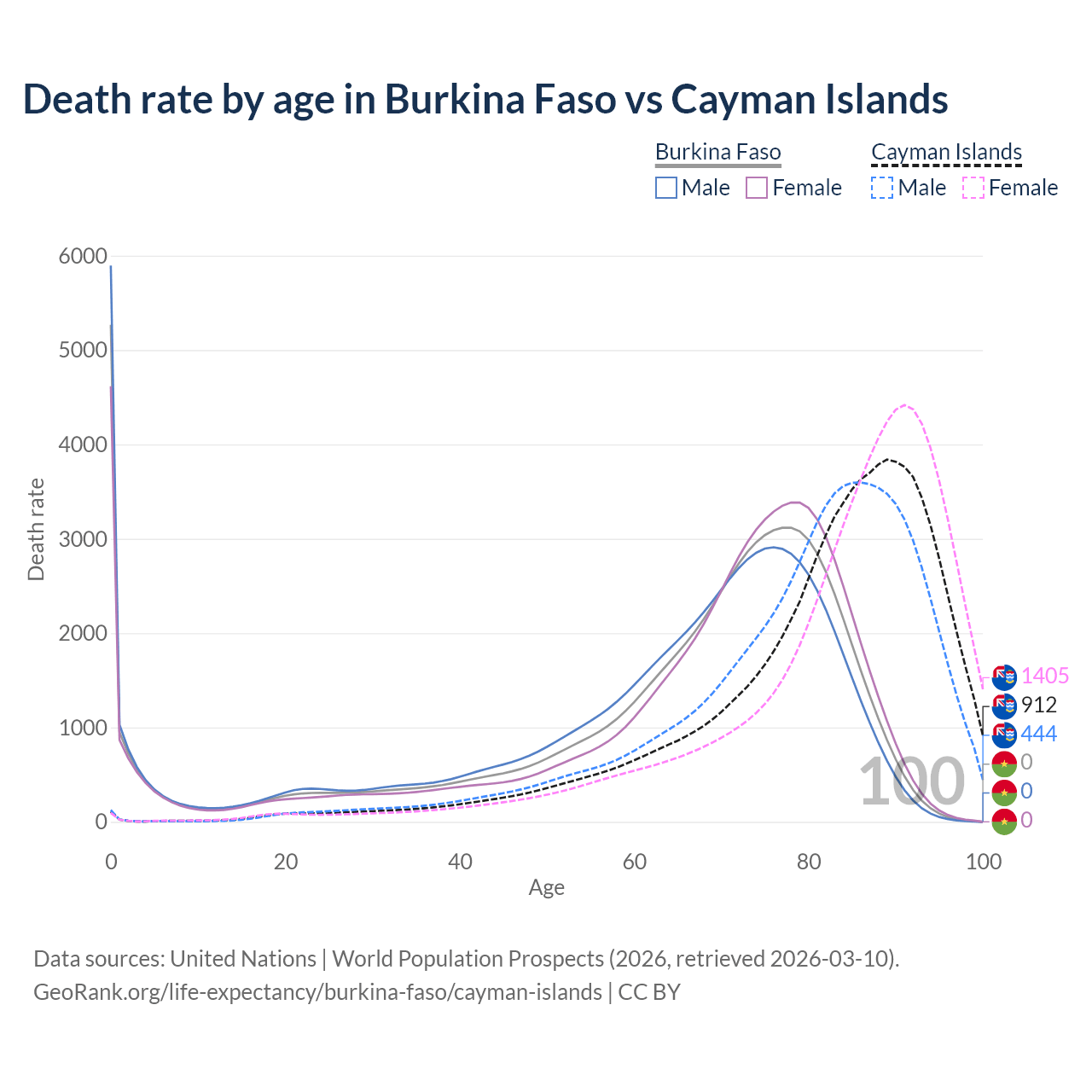 In Burkina Faso, the most common age of death is 0, compared to 89 in the Cayman Islands. The median age of death is 70.4 in Burkina Faso and 84.9 in the Cayman Islands, meaning only half of each cohort is expected to live past that age.