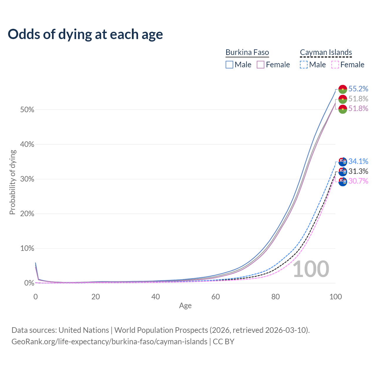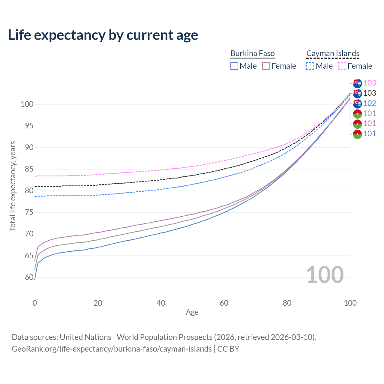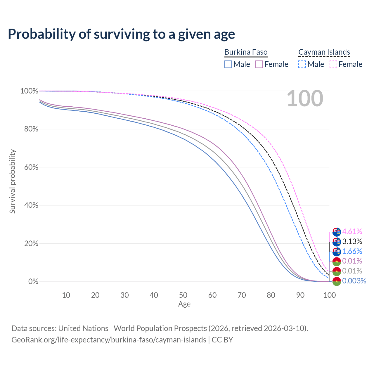This life expectancy calculator shows the odds of living to 100, 95, 90, and below based on current age for both males and females in Burkina Faso and the Cayman Islands, along with mean and median age of death. The calculations are based on the 2026 life tables (actuarial tables) from the UN World Population Prospects.
