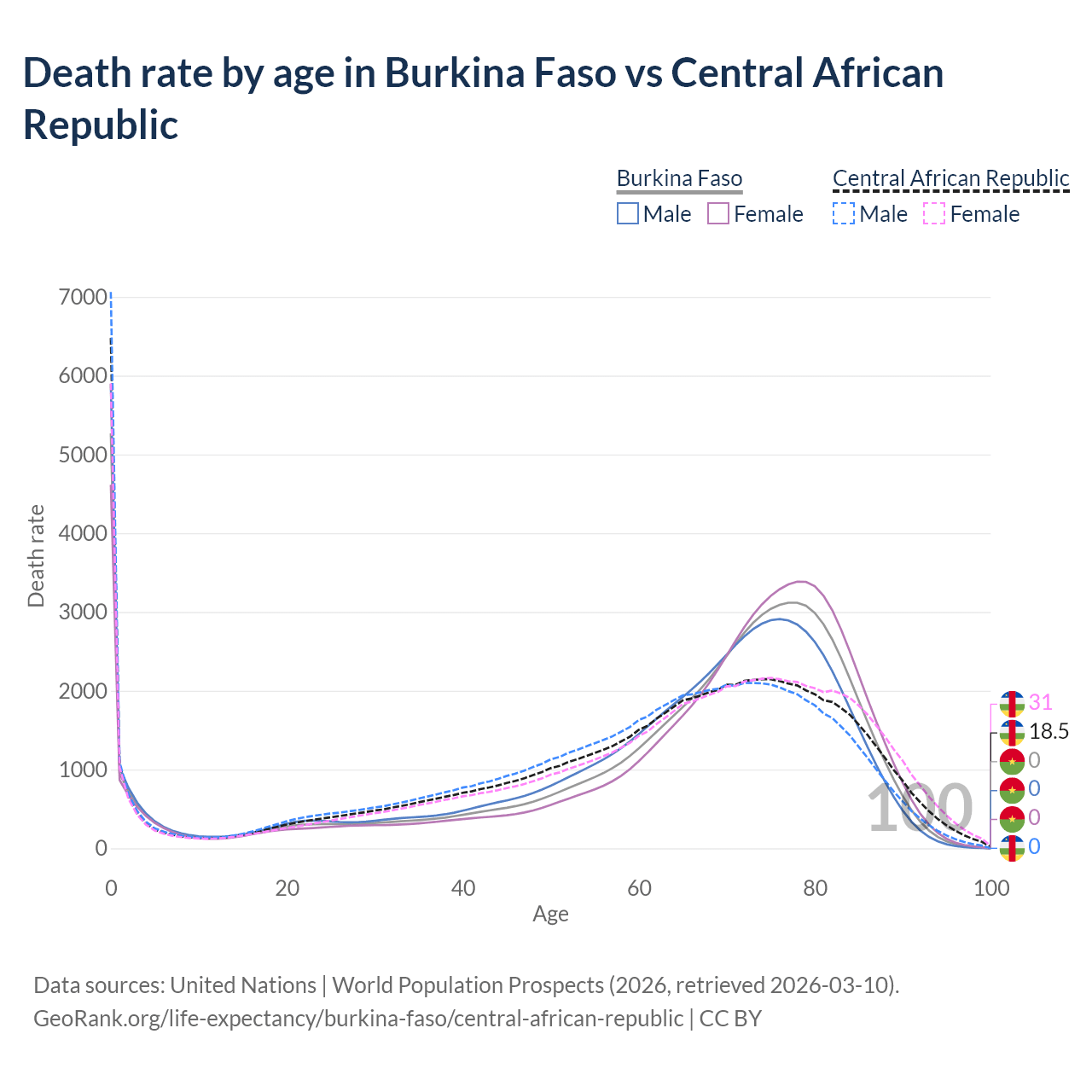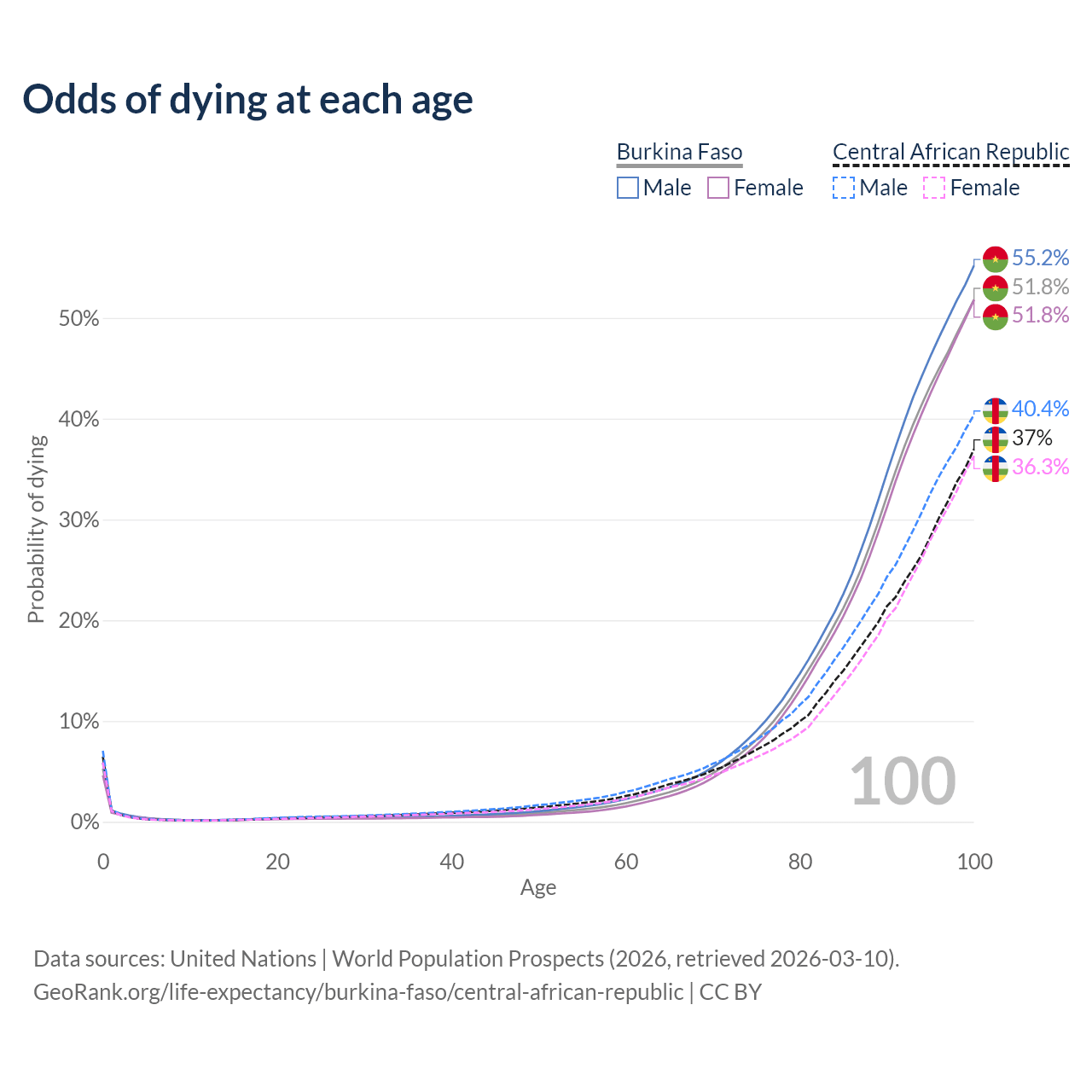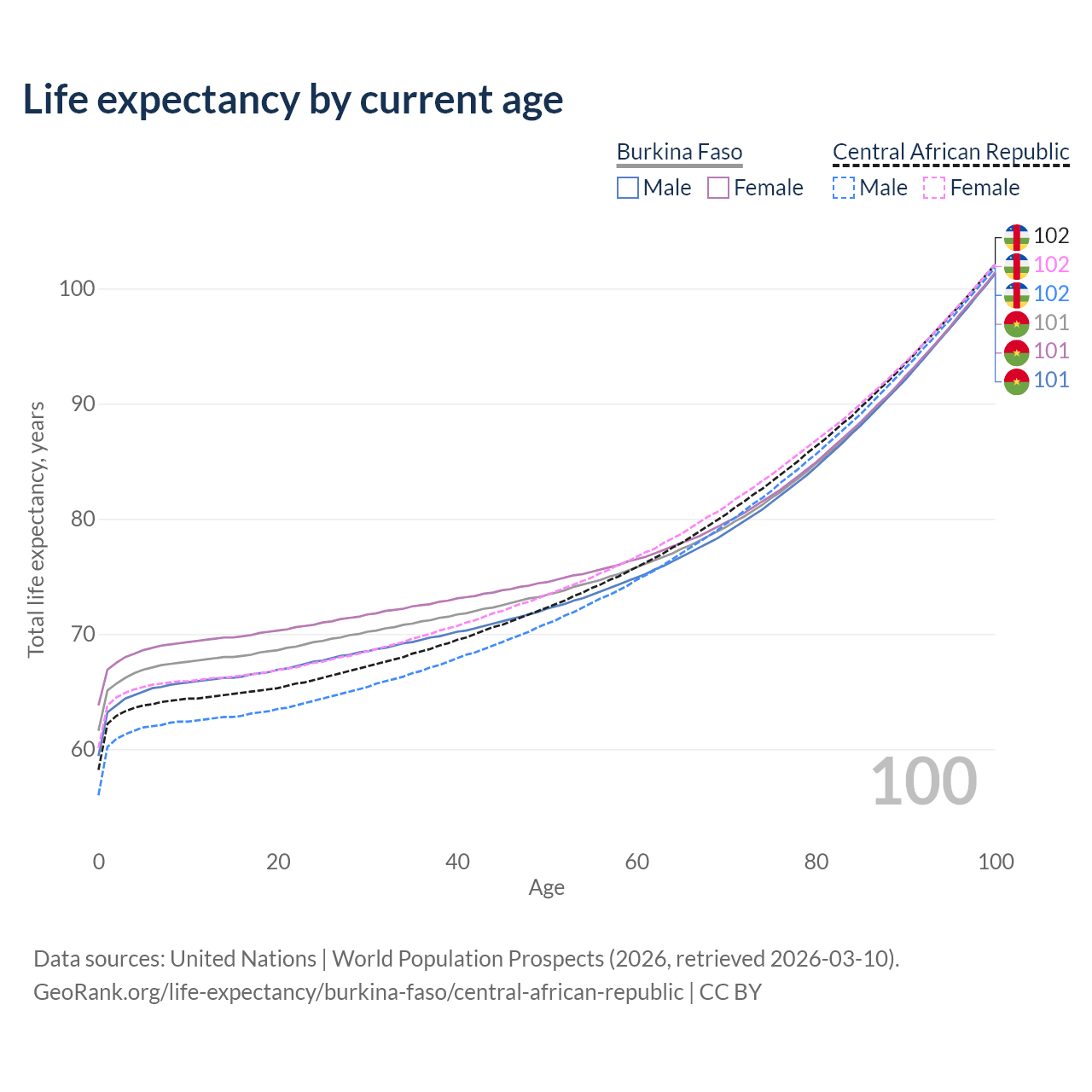 This life expectancy calculator shows the odds of living to 100, 95, 90, and below based on current age for both males and females in Burkina Faso and the Central African Republic, along with mean and median age of death. The calculations are based on the 2026 life tables (actuarial tables) from the UN World Population Prospects.