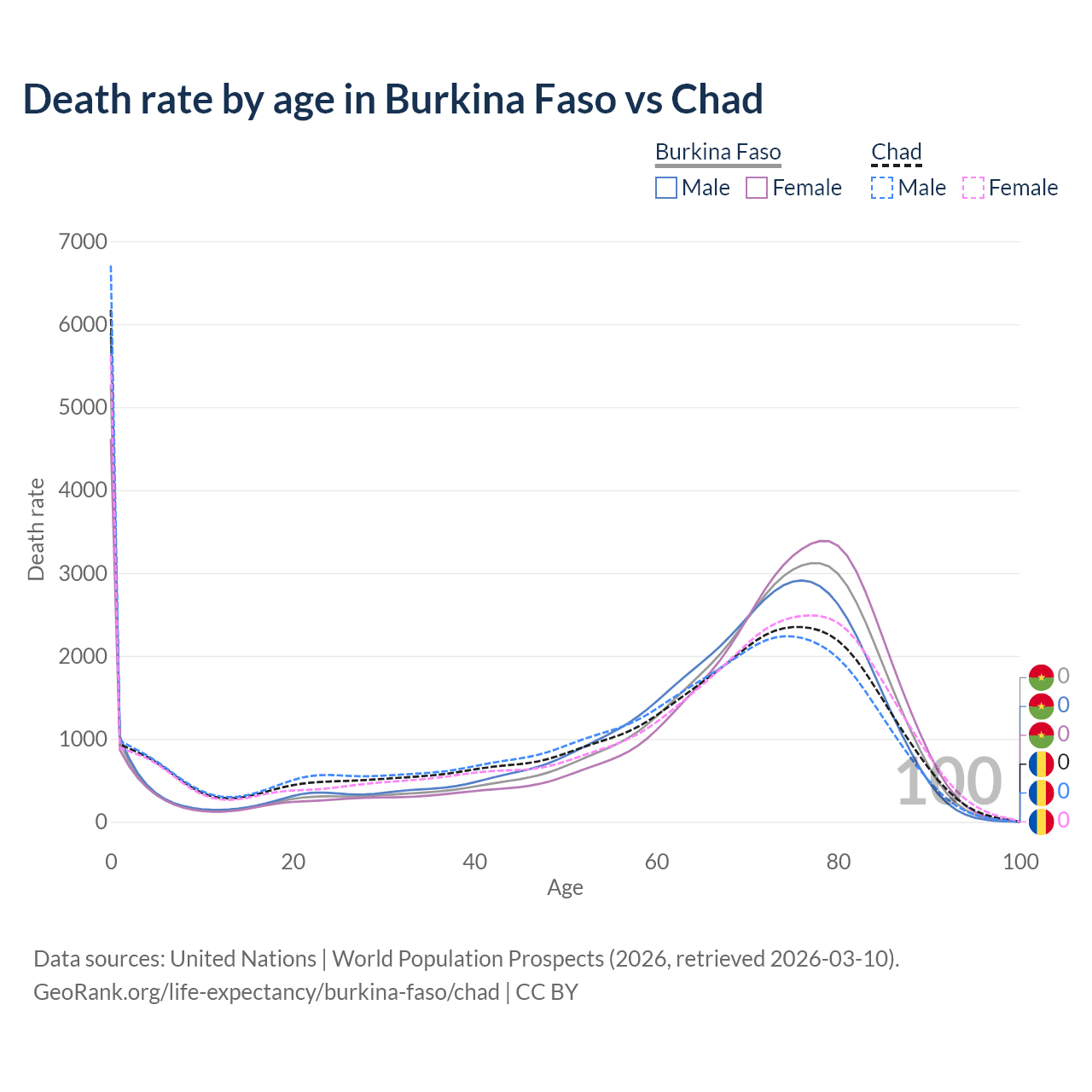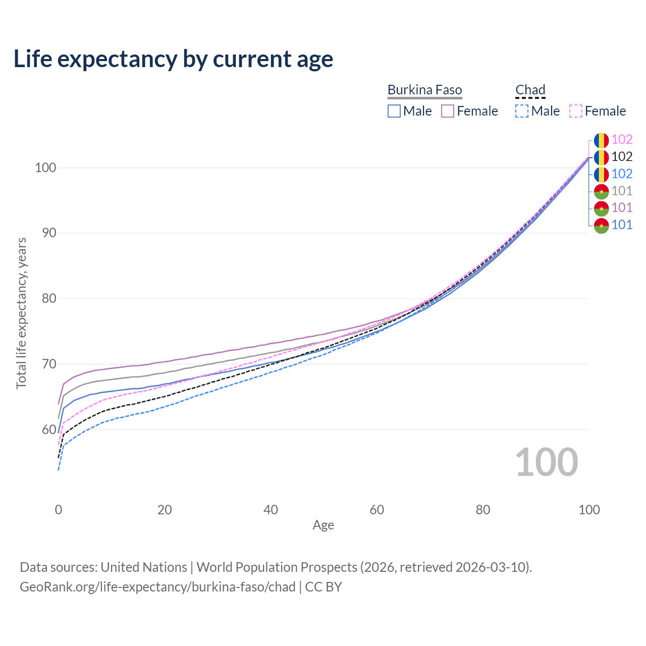 This life expectancy calculator shows the odds of living to 100, 95, 90, and below based on current age for both males and females in Burkina Faso and Chad, along with mean and median age of death. The calculations are based on the 2026 life tables (actuarial tables) from the UN World Population Prospects.