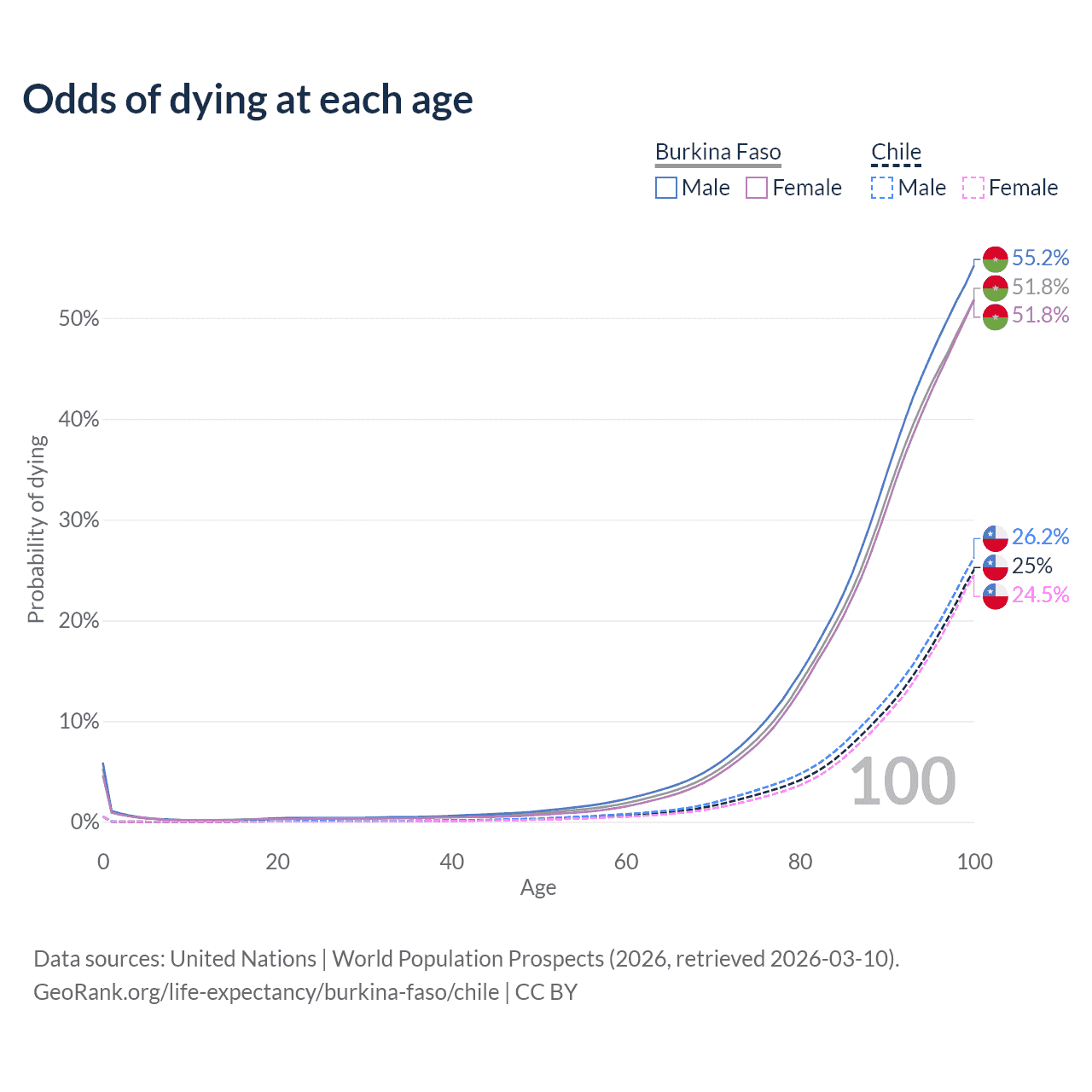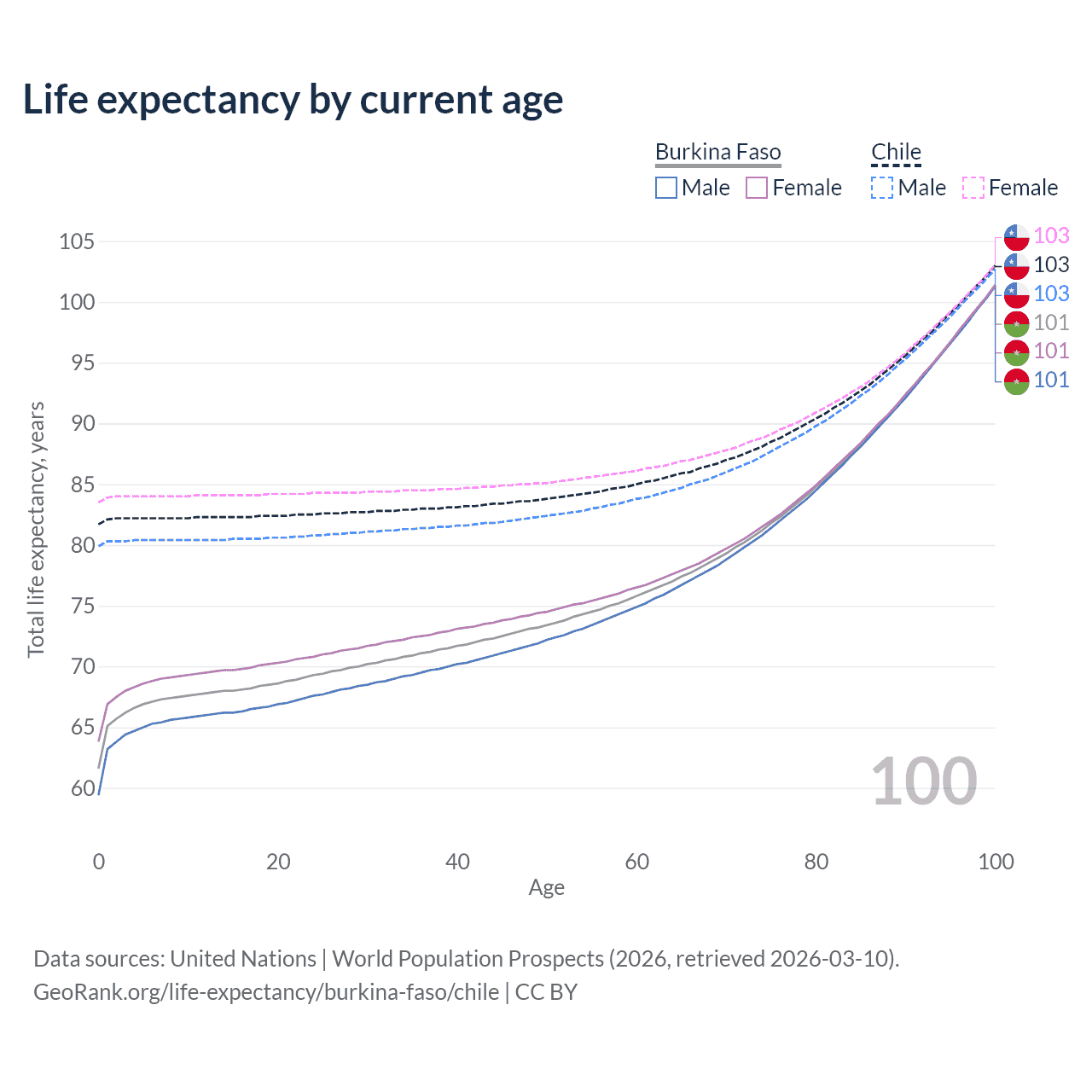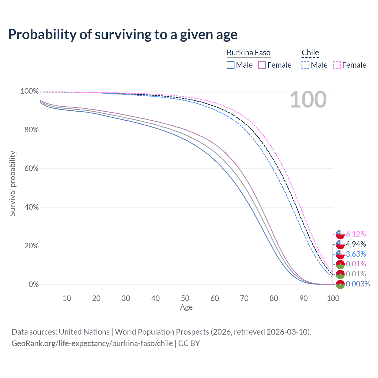 This life expectancy calculator shows the odds of living to 100, 95, 90, and below based on current age for both males and females in Burkina Faso and Chile, along with mean and median age of death. The calculations are based on the 2026 life tables (actuarial tables) from the UN World Population Prospects.