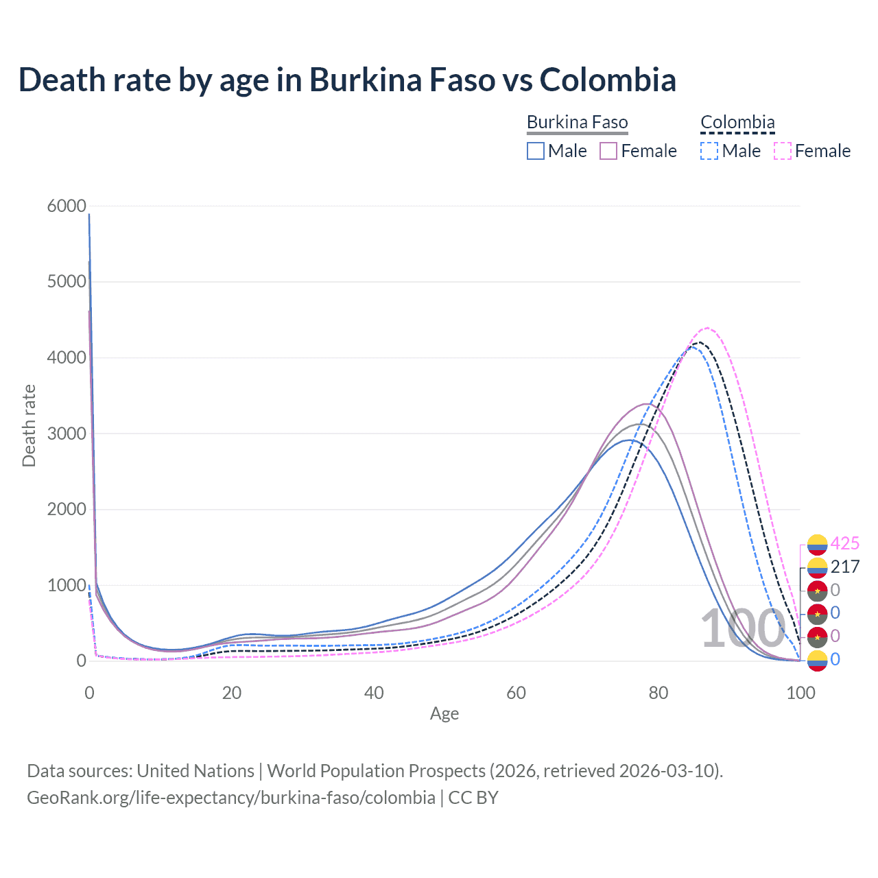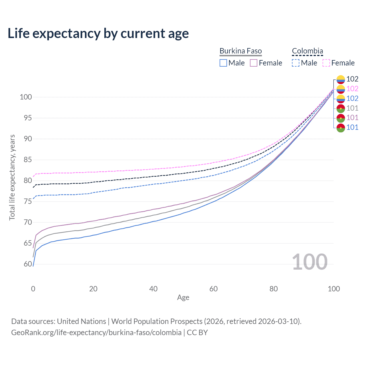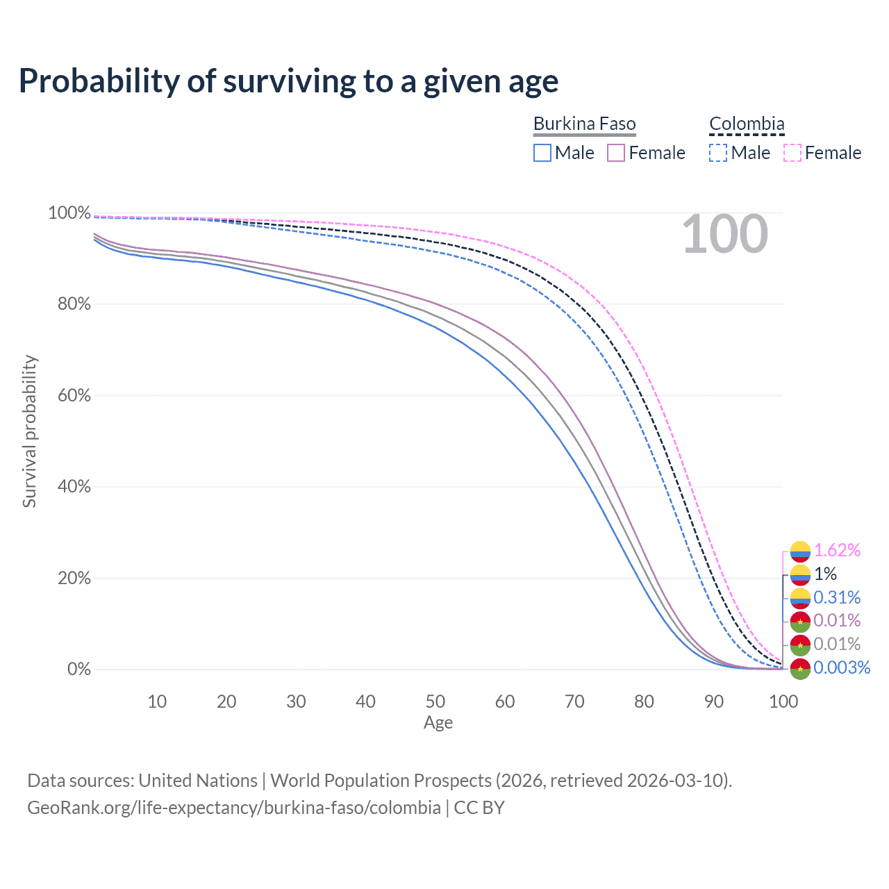 This life expectancy calculator shows the odds of living to 100, 95, 90, and below based on current age for both males and females in Burkina Faso and Colombia, along with mean and median age of death. The calculations are based on the 2026 life tables (actuarial tables) from the UN World Population Prospects.