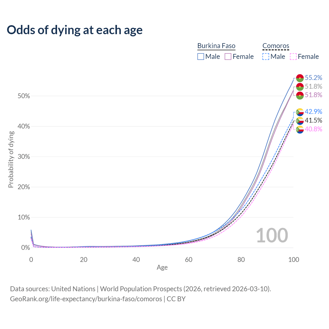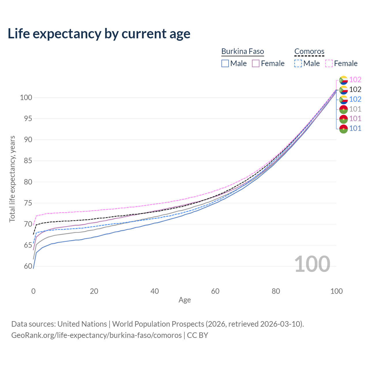 This life expectancy calculator shows the odds of living to 100, 95, 90, and below based on current age for both males and females in Burkina Faso and Comoros, along with mean and median age of death. The calculations are based on the 2026 life tables (actuarial tables) from the UN World Population Prospects.