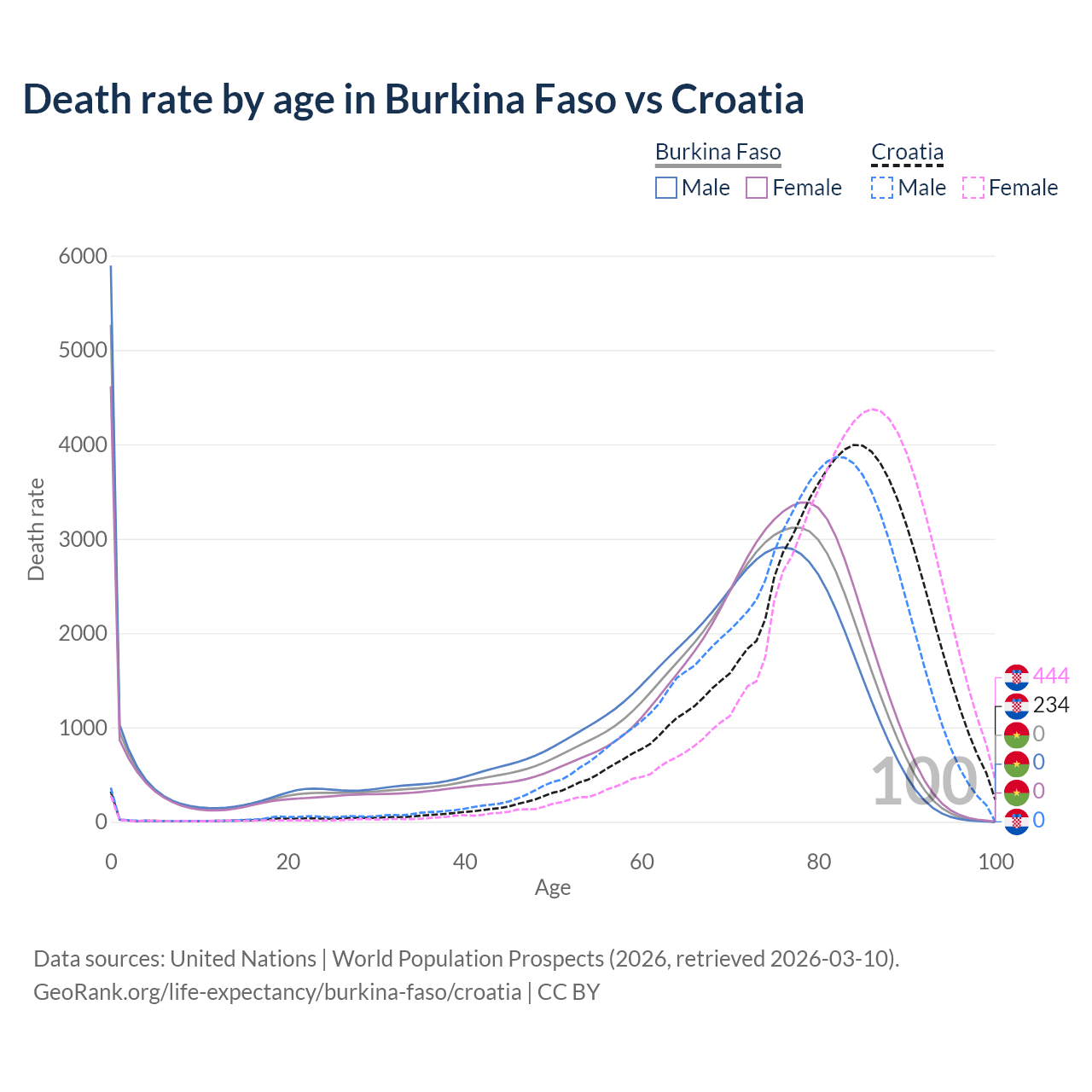 In Burkina Faso, the most common age of death is 0, compared to 84 in Croatia. The median age of death is 70.4 in Burkina Faso and 81.7 in Croatia, meaning only half of each cohort is expected to live past that age.
