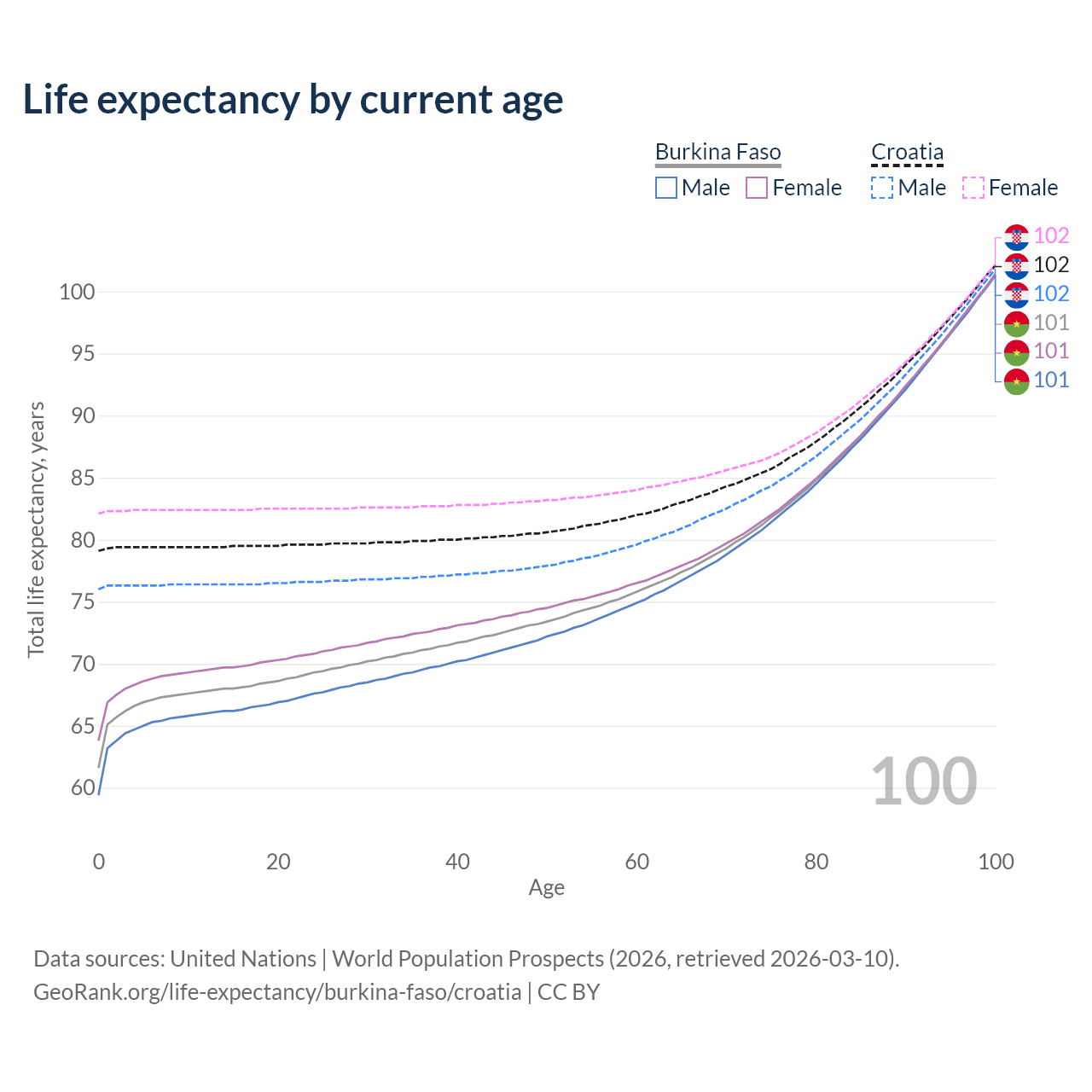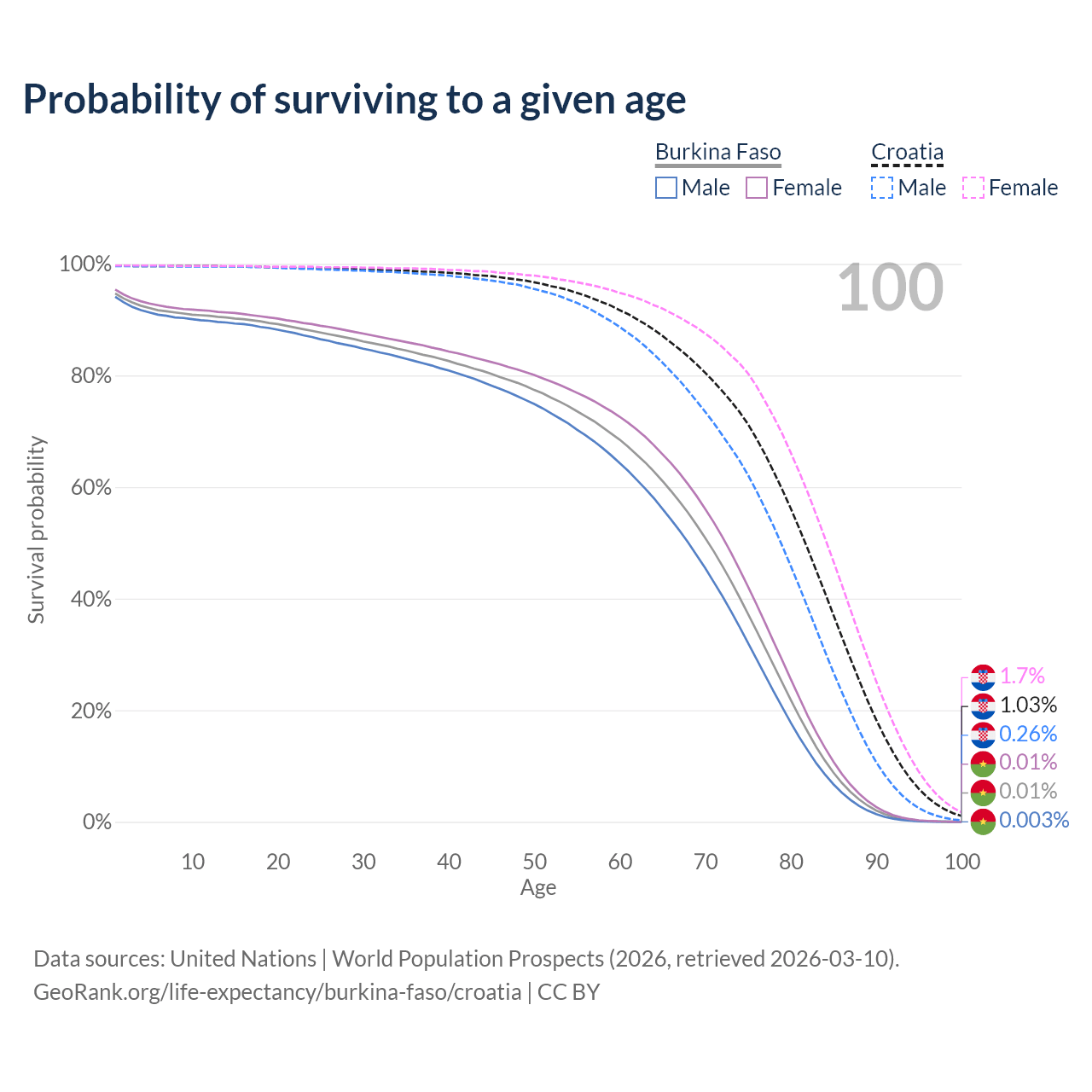 This life expectancy calculator shows the odds of living to 100, 95, 90, and below based on current age for both males and females in Burkina Faso and Croatia, along with mean and median age of death. The calculations are based on the 2026 life tables (actuarial tables) from the UN World Population Prospects.