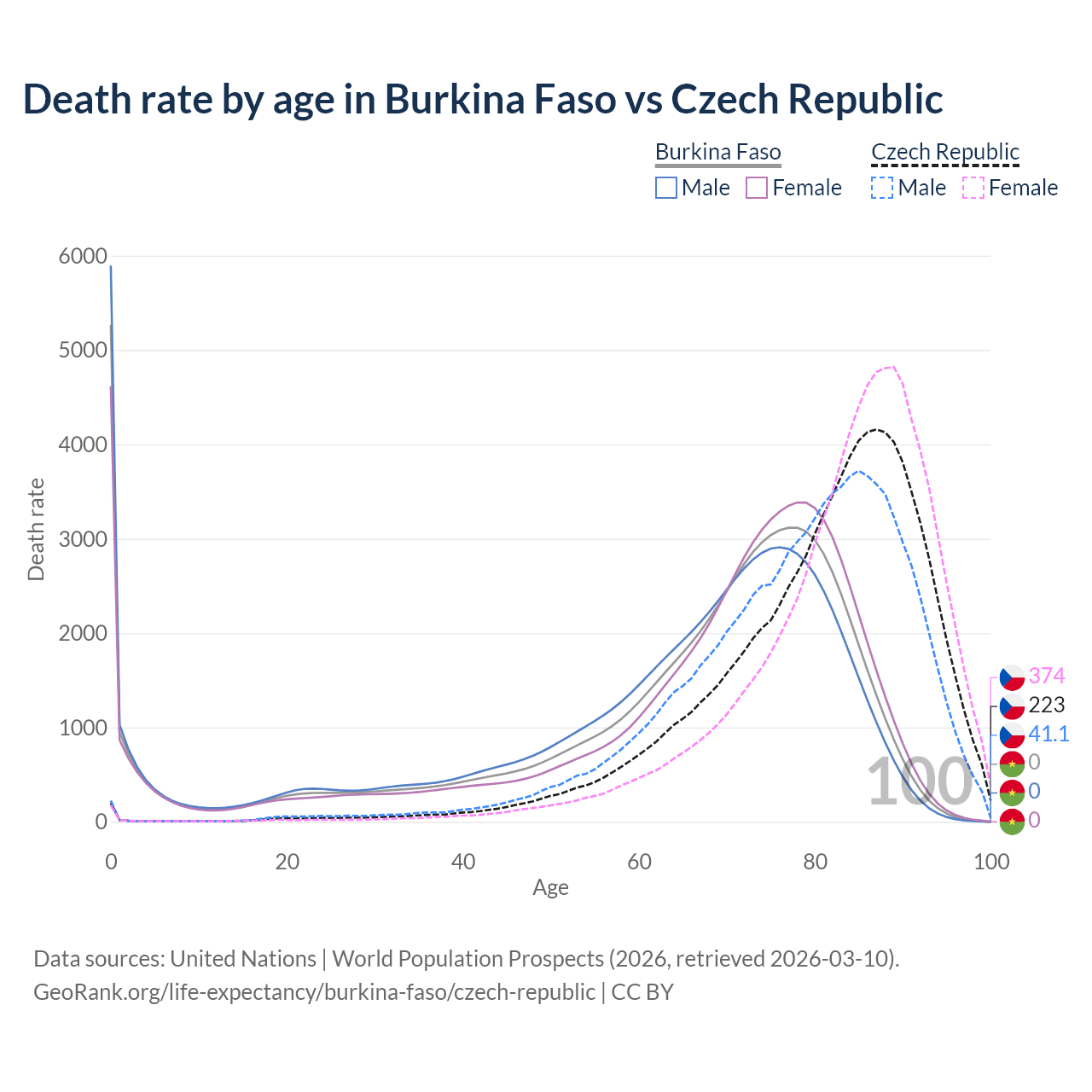 In Burkina Faso, the most common age of death is 0, compared to 87 in the Czech Republic. The median age of death is 70.4 in Burkina Faso and 83.2 in the Czech Republic, meaning only half of each cohort is expected to live past that age.