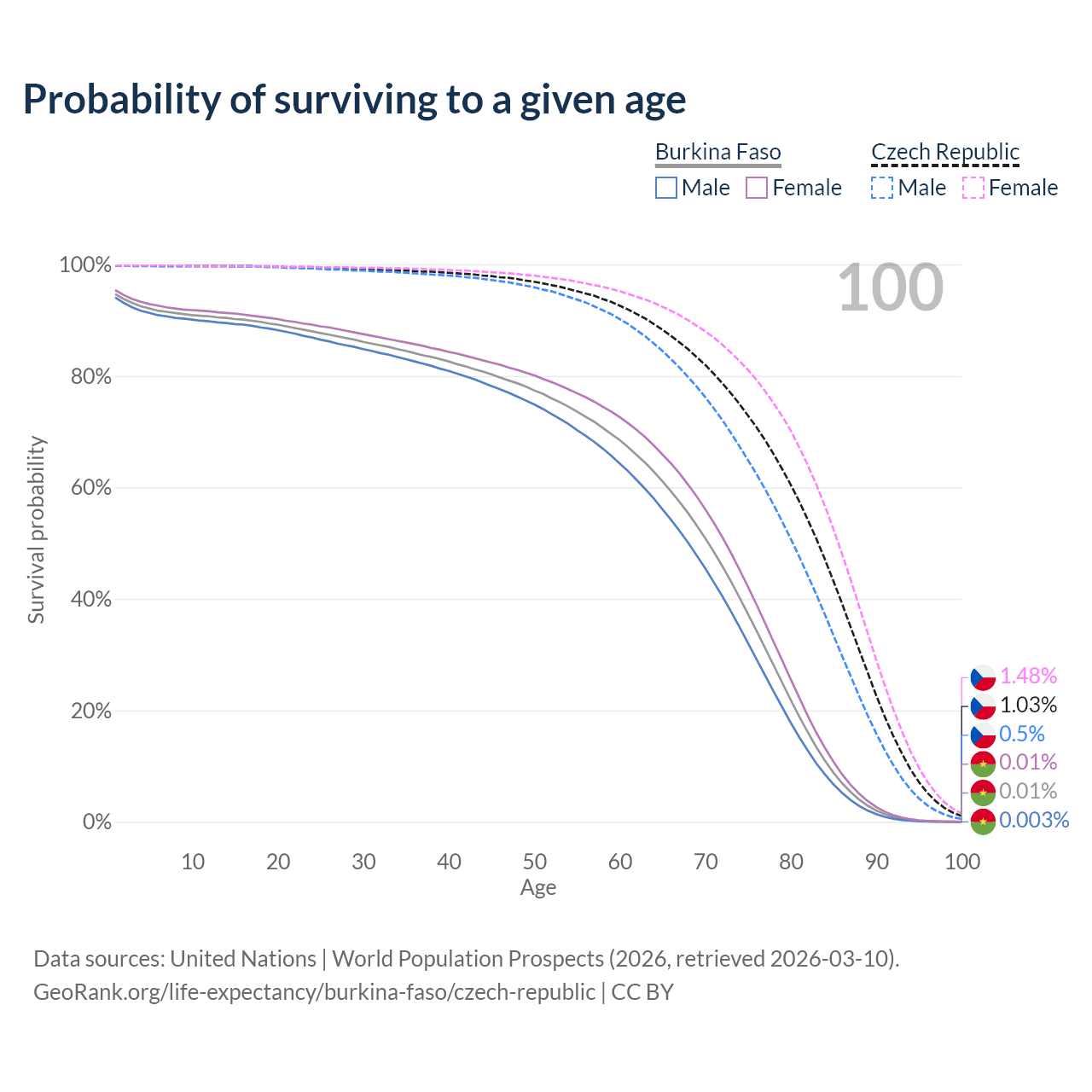 This life expectancy calculator shows the odds of living to 100, 95, 90, and below based on current age for both males and females in Burkina Faso and the Czech Republic, along with mean and median age of death. The calculations are based on the 2026 life tables (actuarial tables) from the UN World Population Prospects.