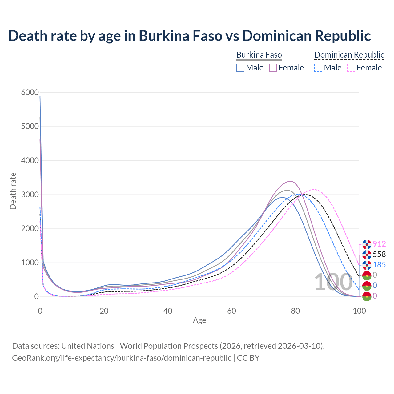 In Burkina Faso, the most common age of death is 0, compared to 83 in the Dominican Republic. The median age of death is 70.4 in Burkina Faso and 78.9 in the Dominican Republic, meaning only half of each cohort is expected to live past that age.