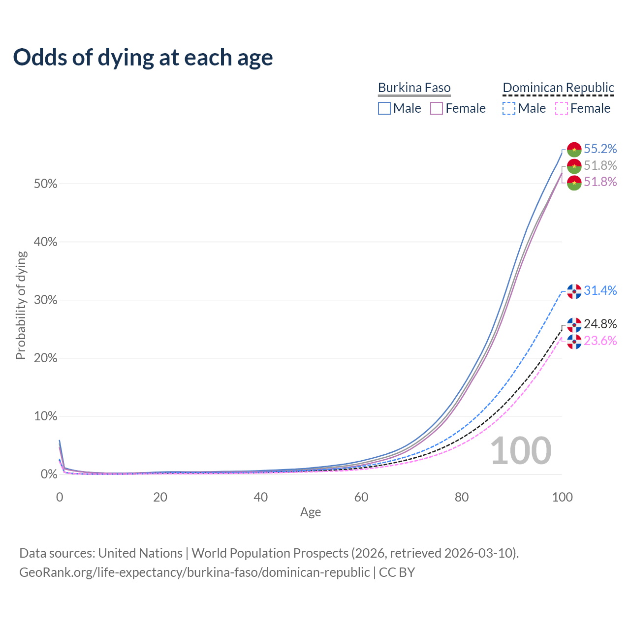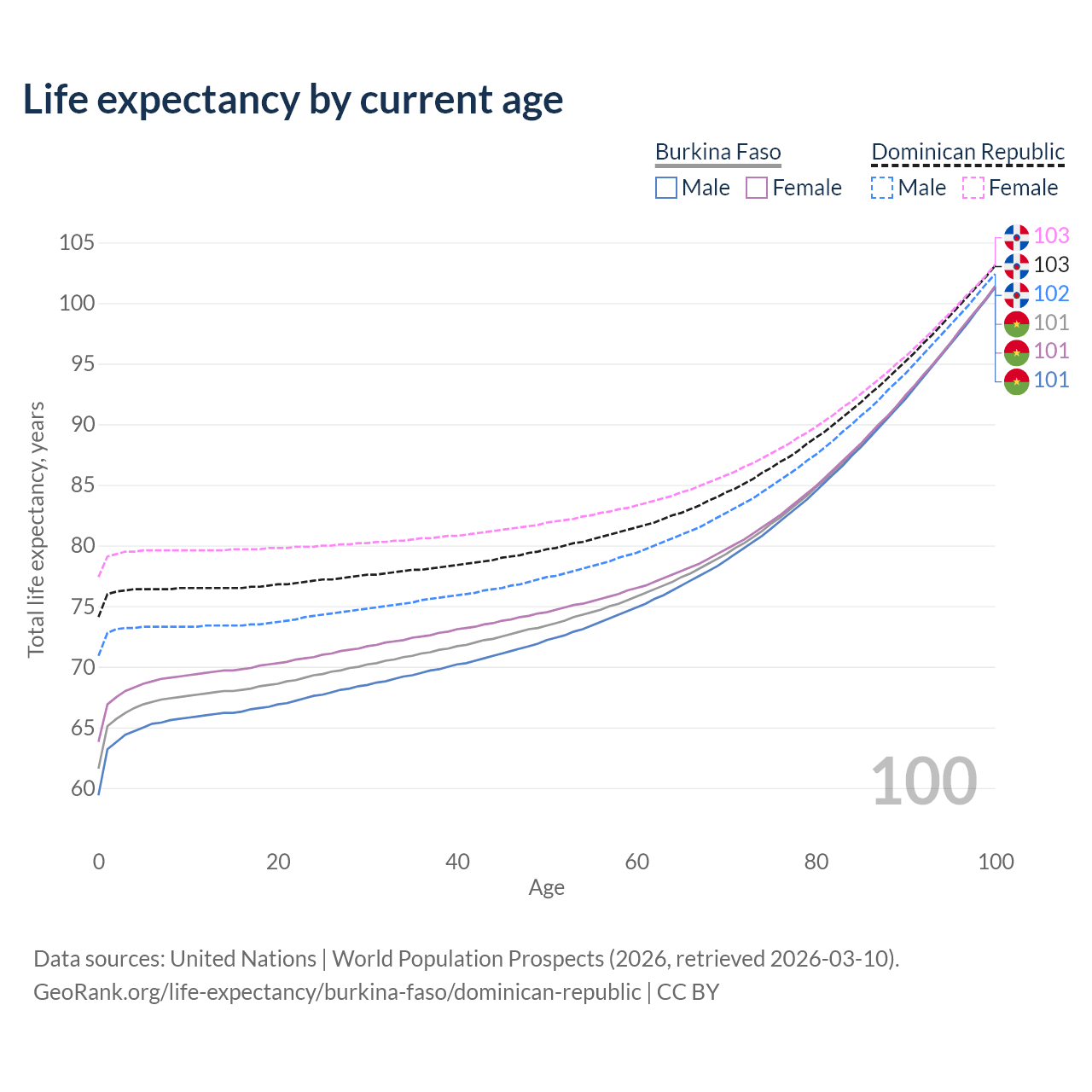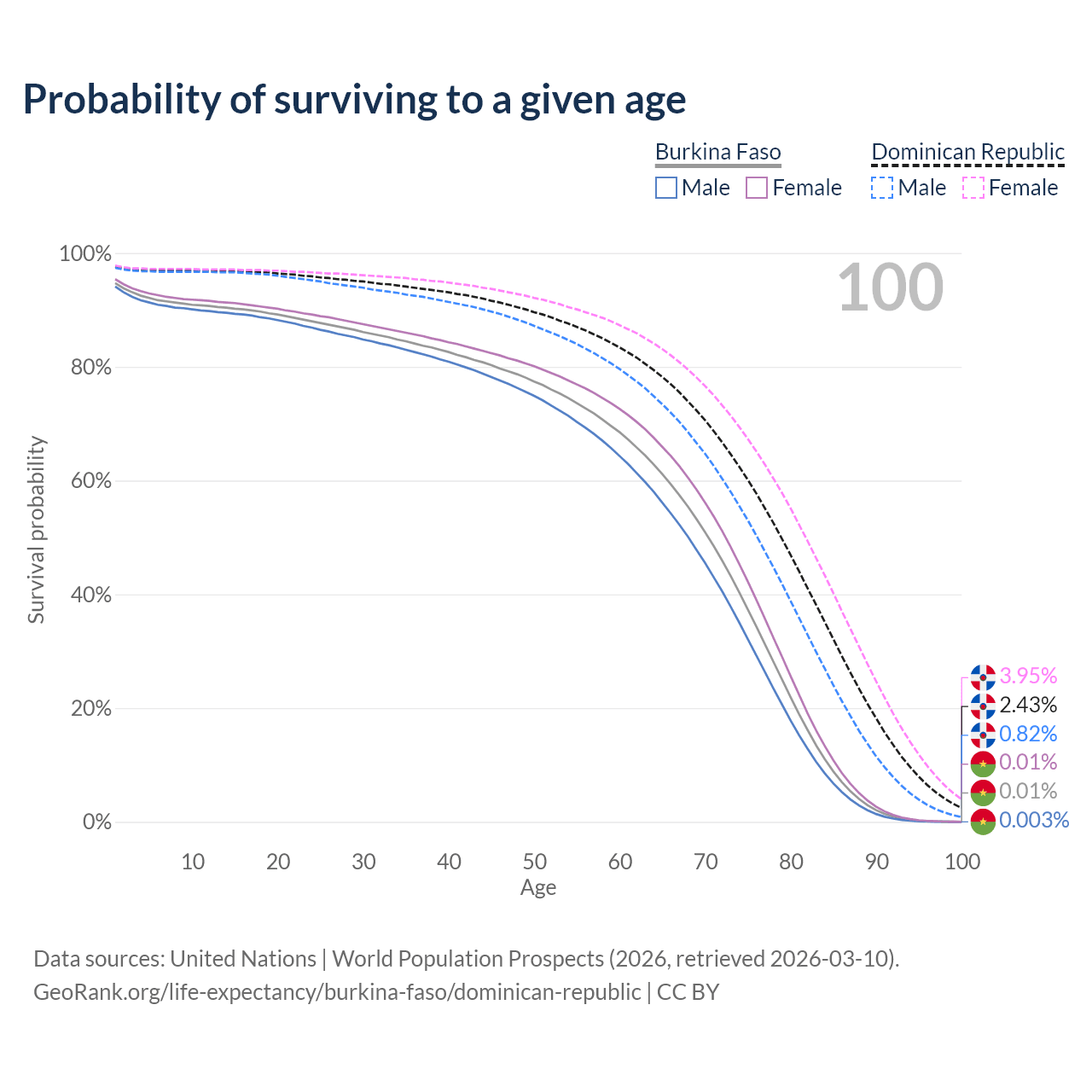 This life expectancy calculator shows the odds of living to 100, 95, 90, and below based on current age for both males and females in Burkina Faso and the Dominican Republic, along with mean and median age of death. The calculations are based on the 2026 life tables (actuarial tables) from the UN World Population Prospects.