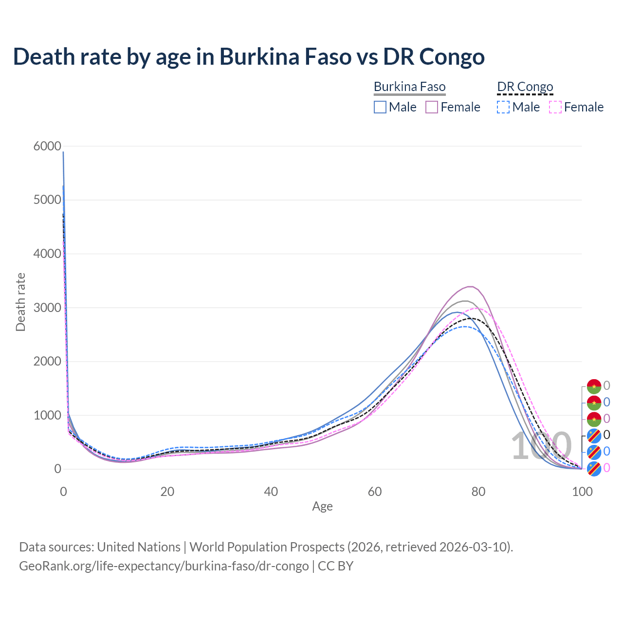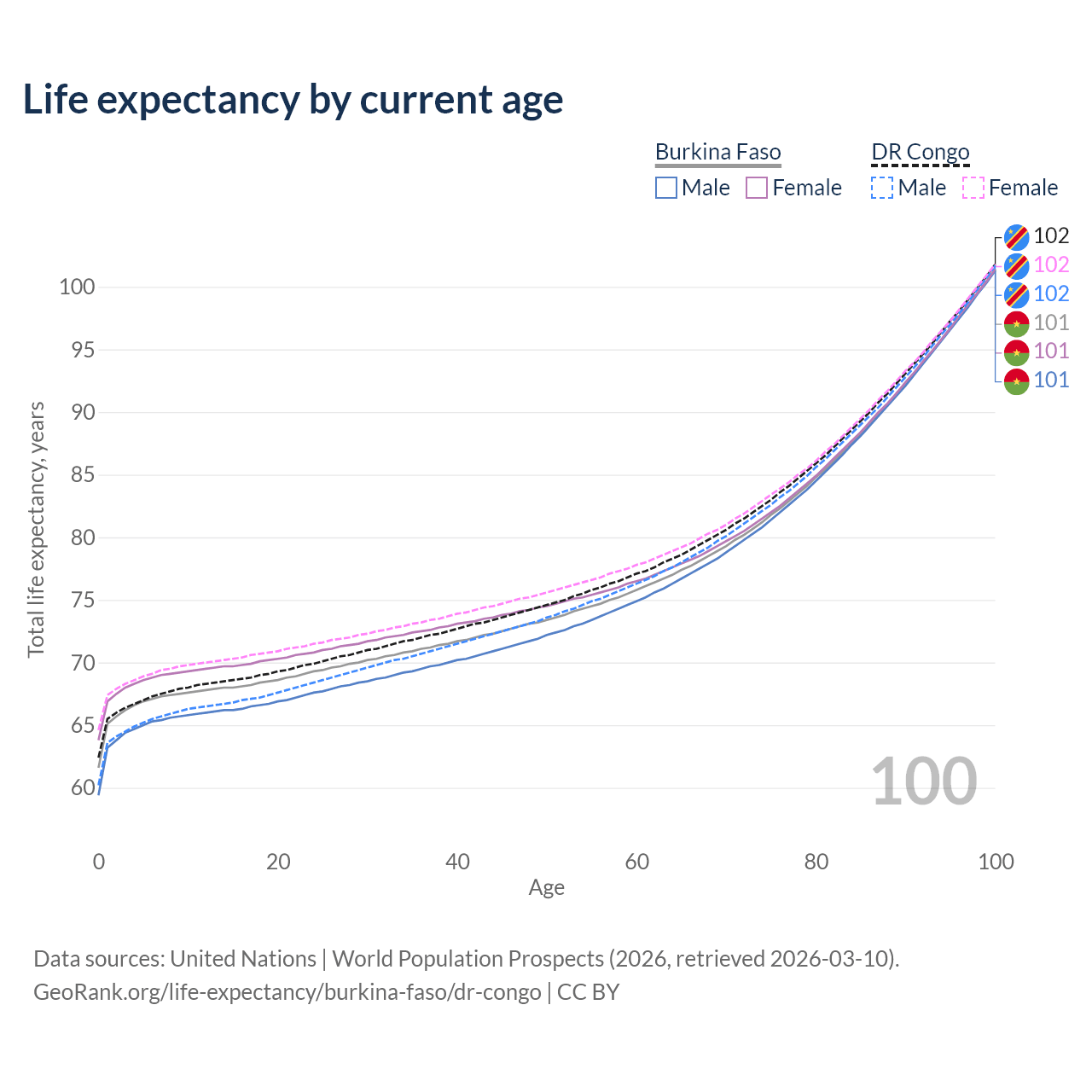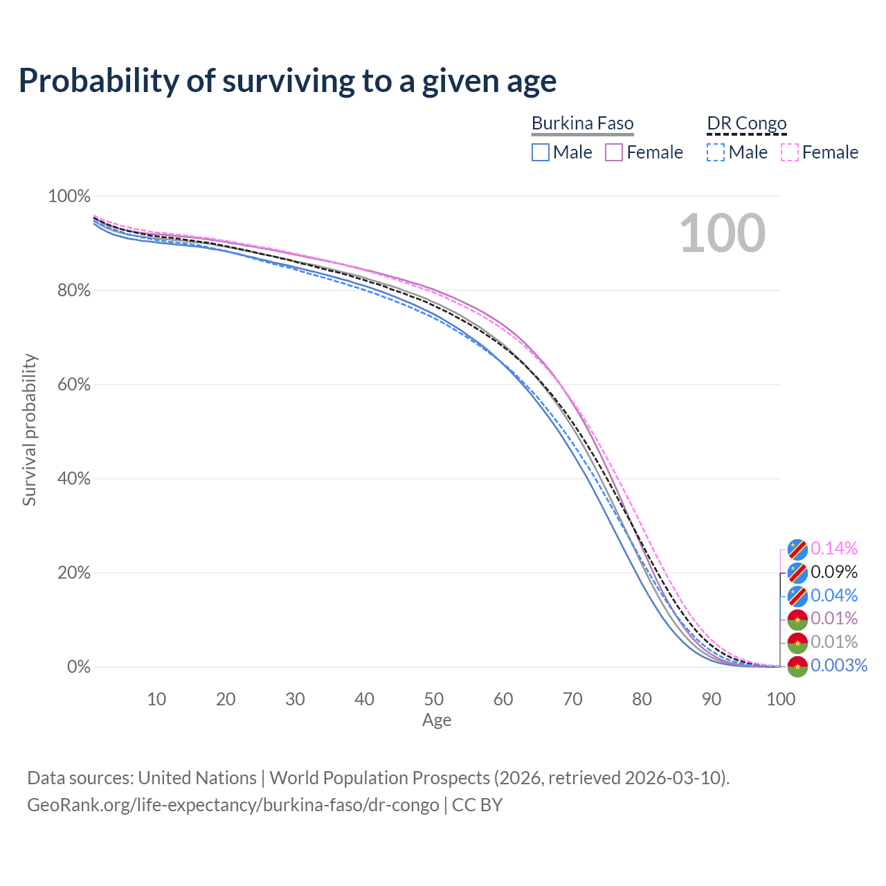 This life expectancy calculator shows the odds of living to 100, 95, 90, and below based on current age for both males and females in Burkina Faso and the DR Congo, along with mean and median age of death. The calculations are based on the 2026 life tables (actuarial tables) from the UN World Population Prospects.