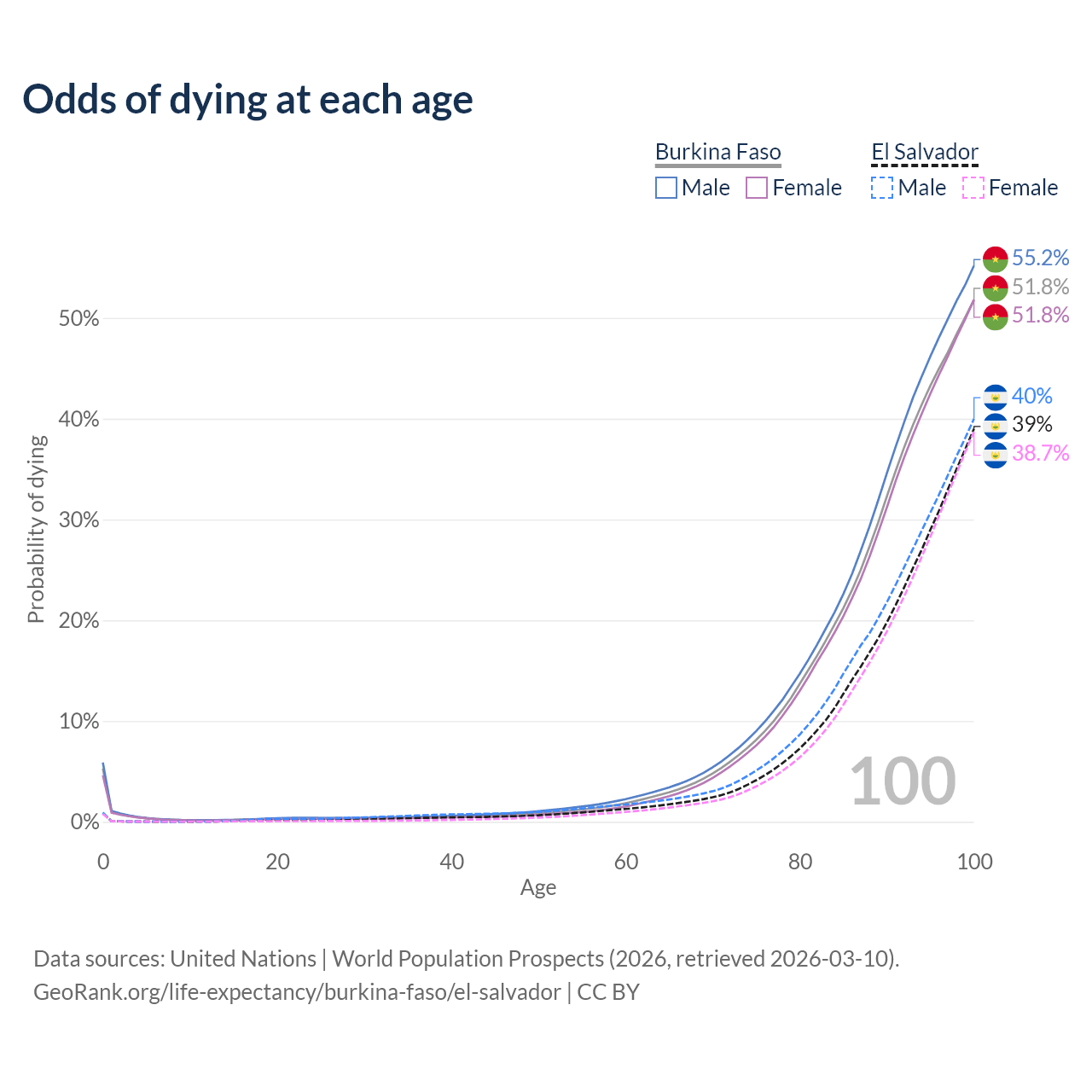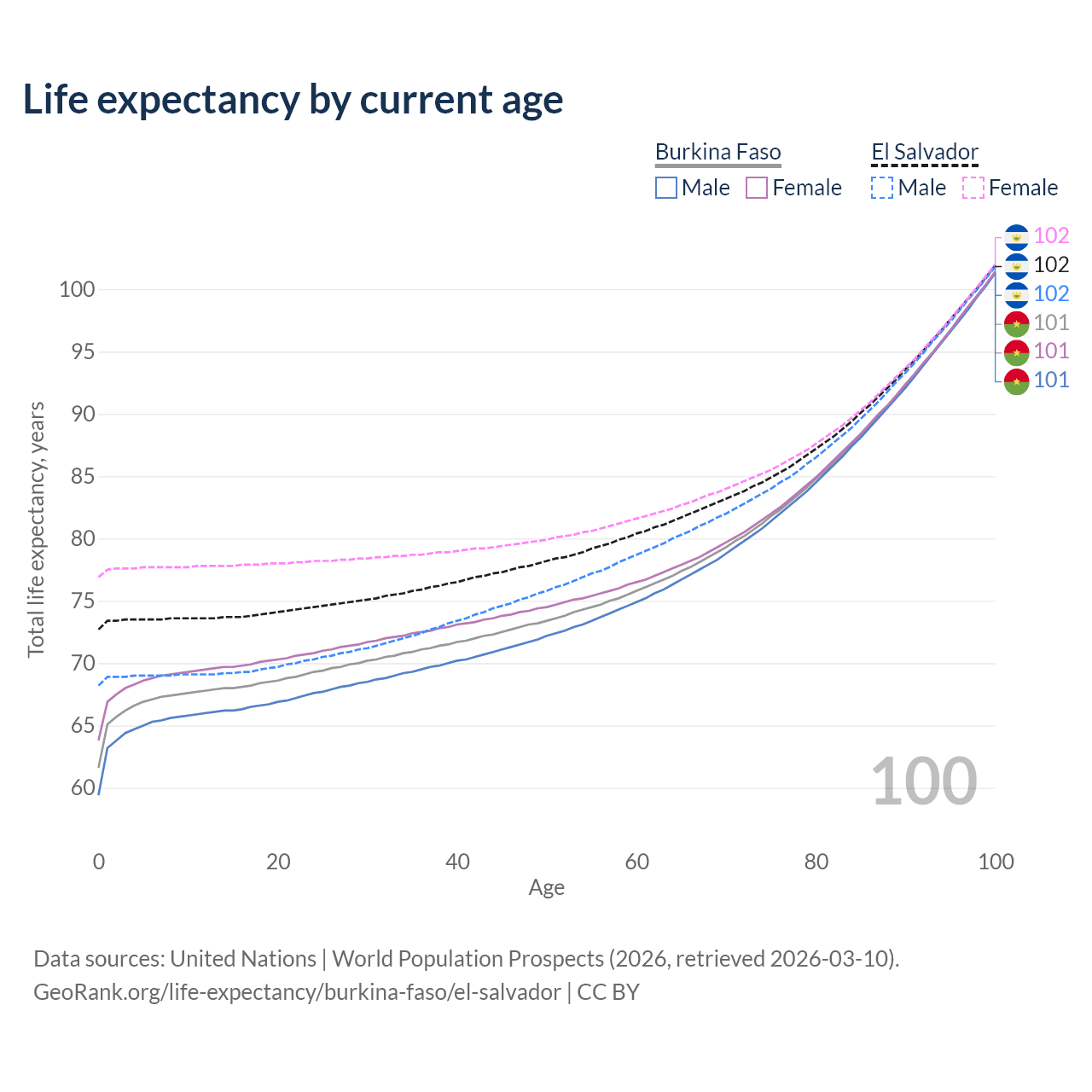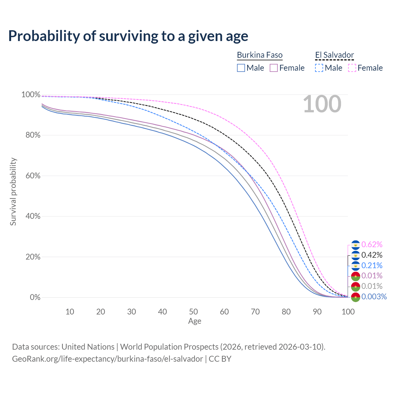 This life expectancy calculator shows the odds of living to 100, 95, 90, and below based on current age for both males and females in Burkina Faso and El Salvador, along with mean and median age of death. The calculations are based on the 2026 life tables (actuarial tables) from the UN World Population Prospects.