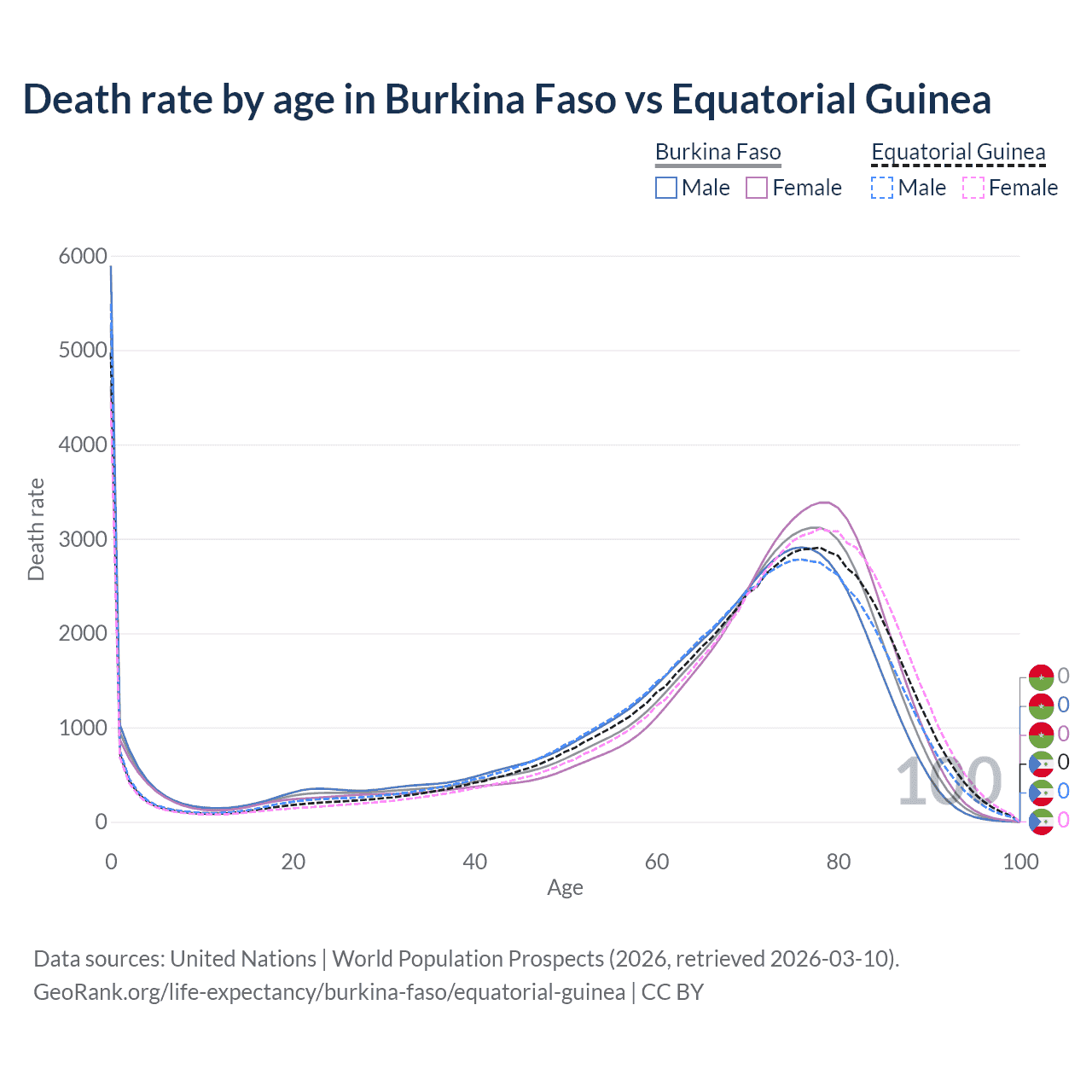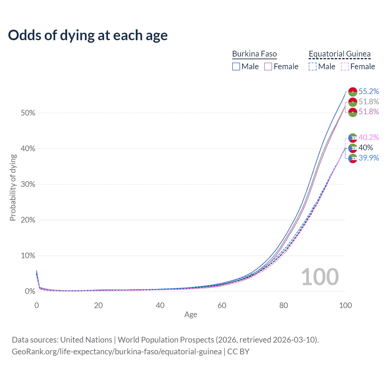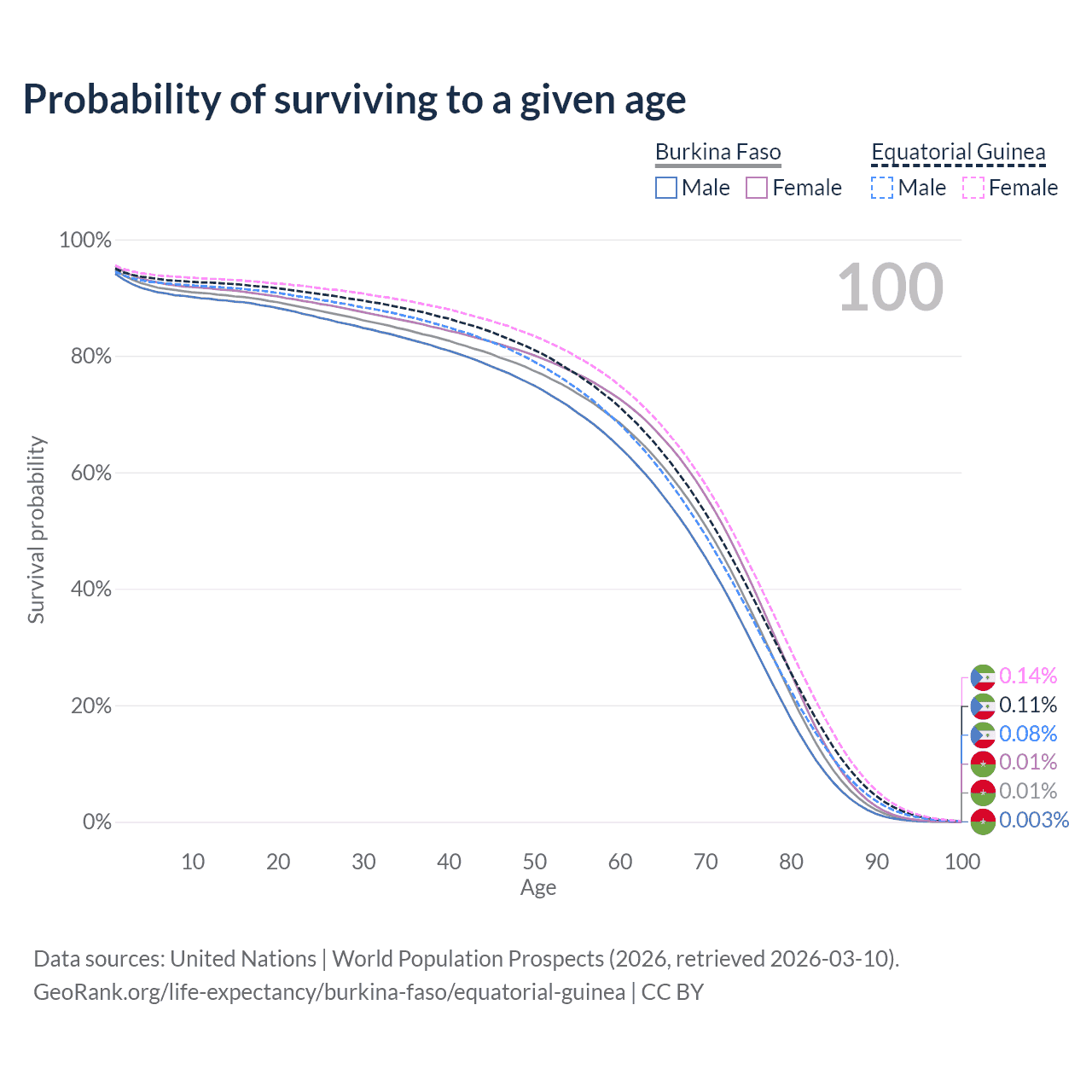 This life expectancy calculator shows the odds of living to 100, 95, 90, and below based on current age for both males and females in Burkina Faso and Equatorial Guinea, along with mean and median age of death. The calculations are based on the 2026 life tables (actuarial tables) from the UN World Population Prospects.