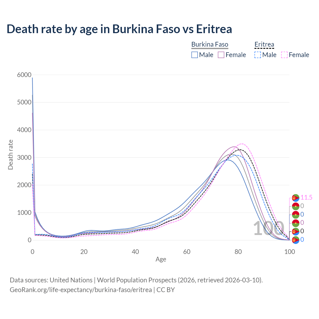 This life expectancy calculator shows the odds of living to 100, 95, 90, and below based on current age for both males and females in Burkina Faso and Eritrea, along with mean and median age of death. The calculations are based on the 2026 life tables (actuarial tables) from the UN World Population Prospects.