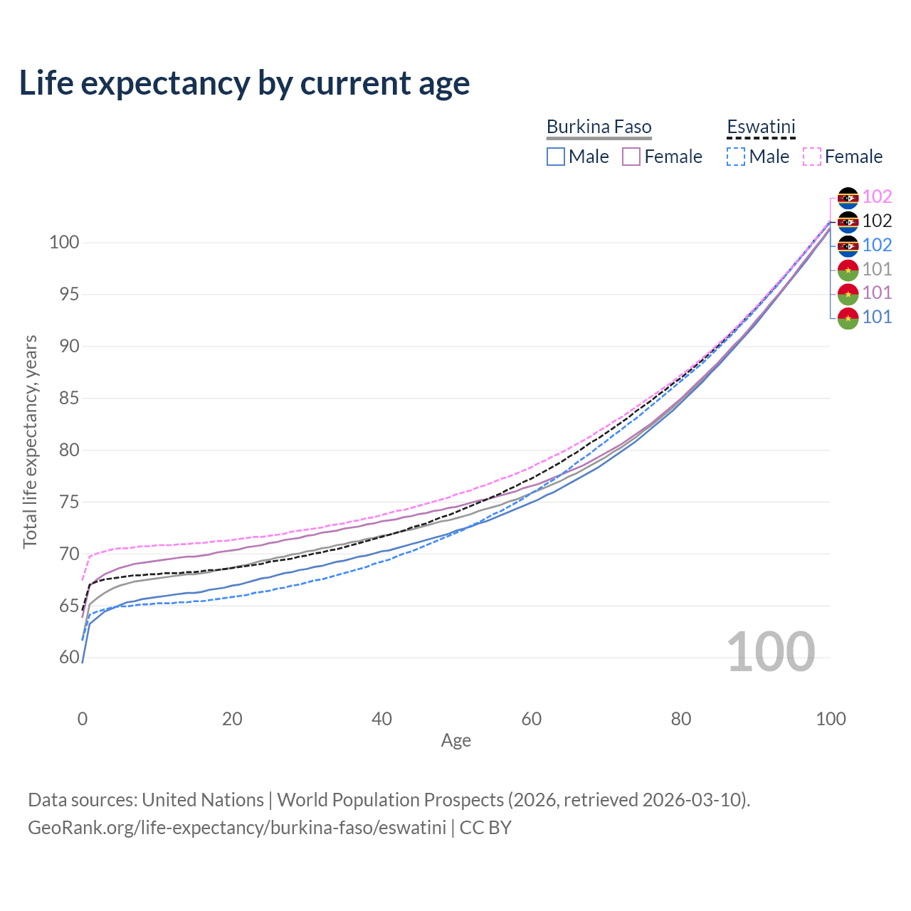 This life expectancy calculator shows the odds of living to 100, 95, 90, and below based on current age for both males and females in Burkina Faso and Eswatini, along with mean and median age of death. The calculations are based on the 2026 life tables (actuarial tables) from the UN World Population Prospects.