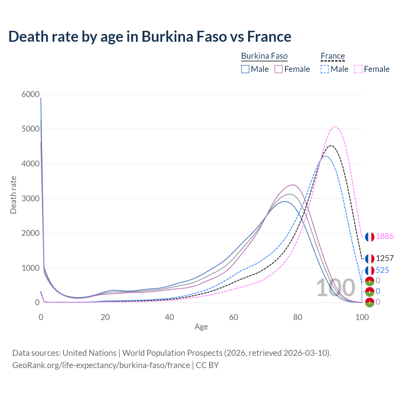 In Burkina Faso, the most common age of death is 0, compared to 90 in France. The median age of death is 70.4 in Burkina Faso and 87.4 in France, meaning only half of each cohort is expected to live past that age.