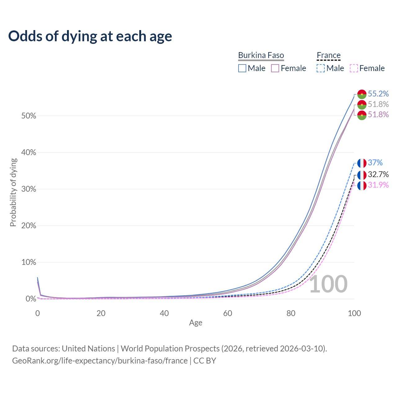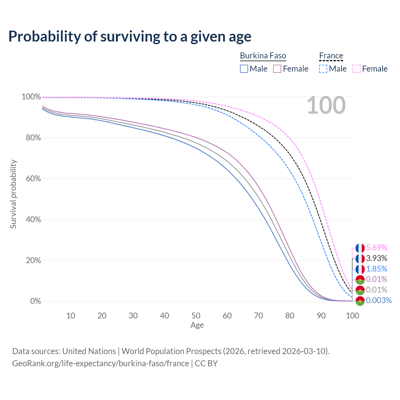 This life expectancy calculator shows the odds of living to 100, 95, 90, and below based on current age for both males and females in Burkina Faso and France, along with mean and median age of death. The calculations are based on the 2026 life tables (actuarial tables) from the UN World Population Prospects.