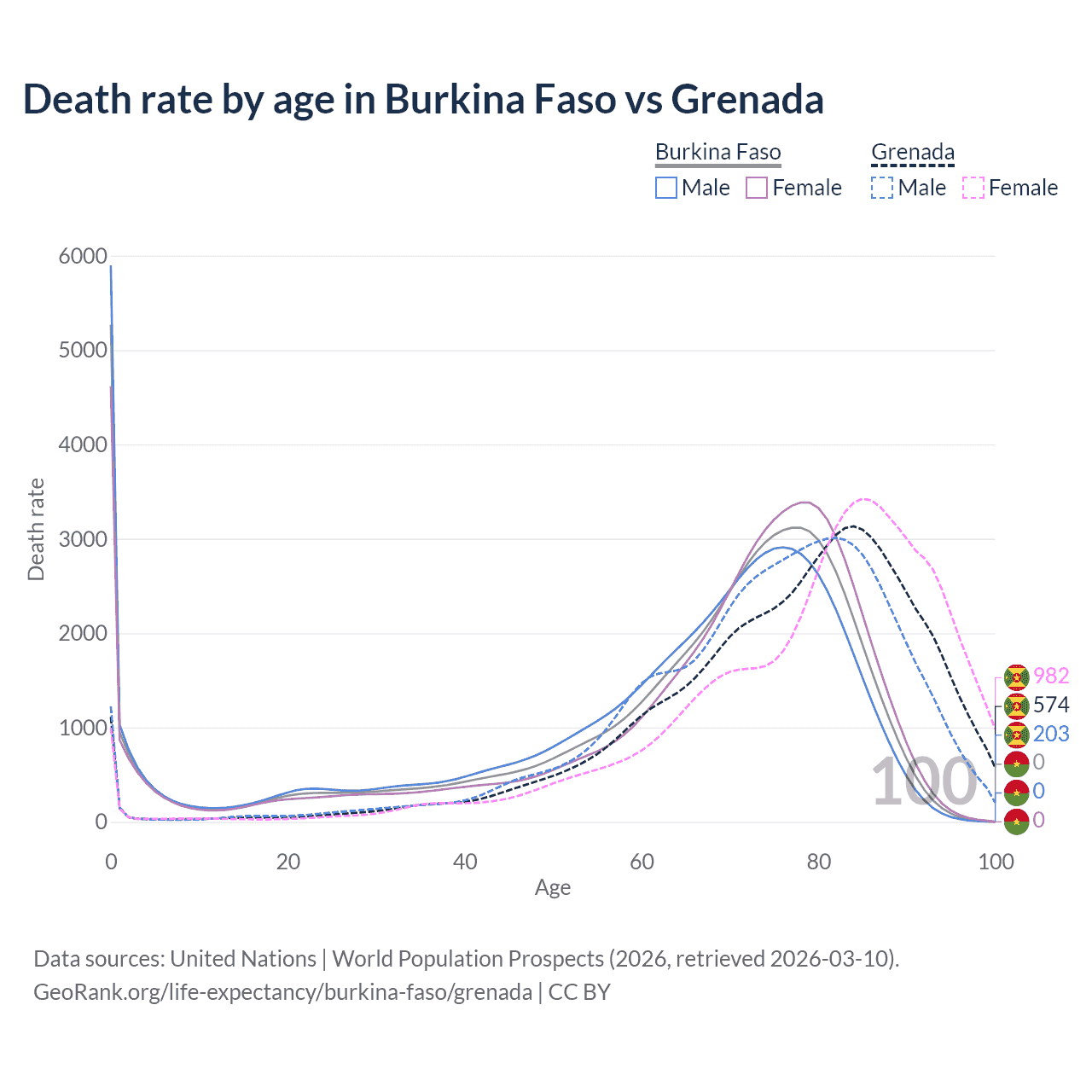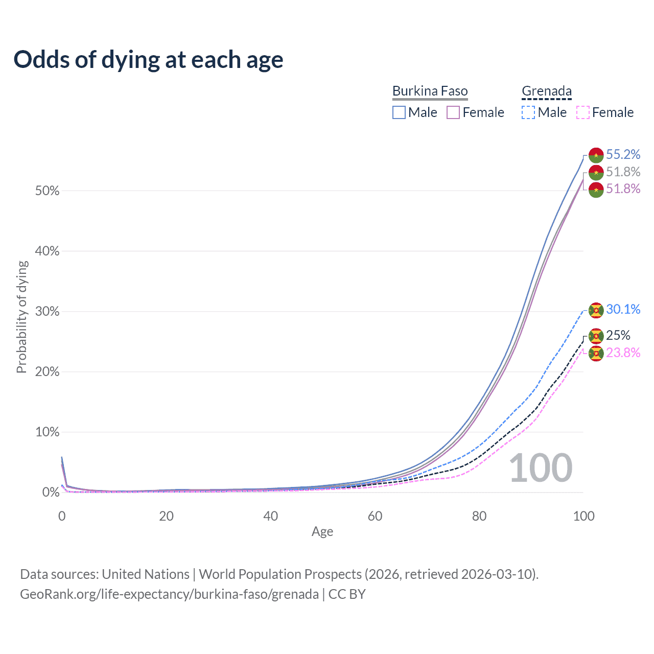 This life expectancy calculator shows the odds of living to 100, 95, 90, and below based on current age for both males and females in Burkina Faso and Grenada, along with mean and median age of death. The calculations are based on the 2026 life tables (actuarial tables) from the UN World Population Prospects.