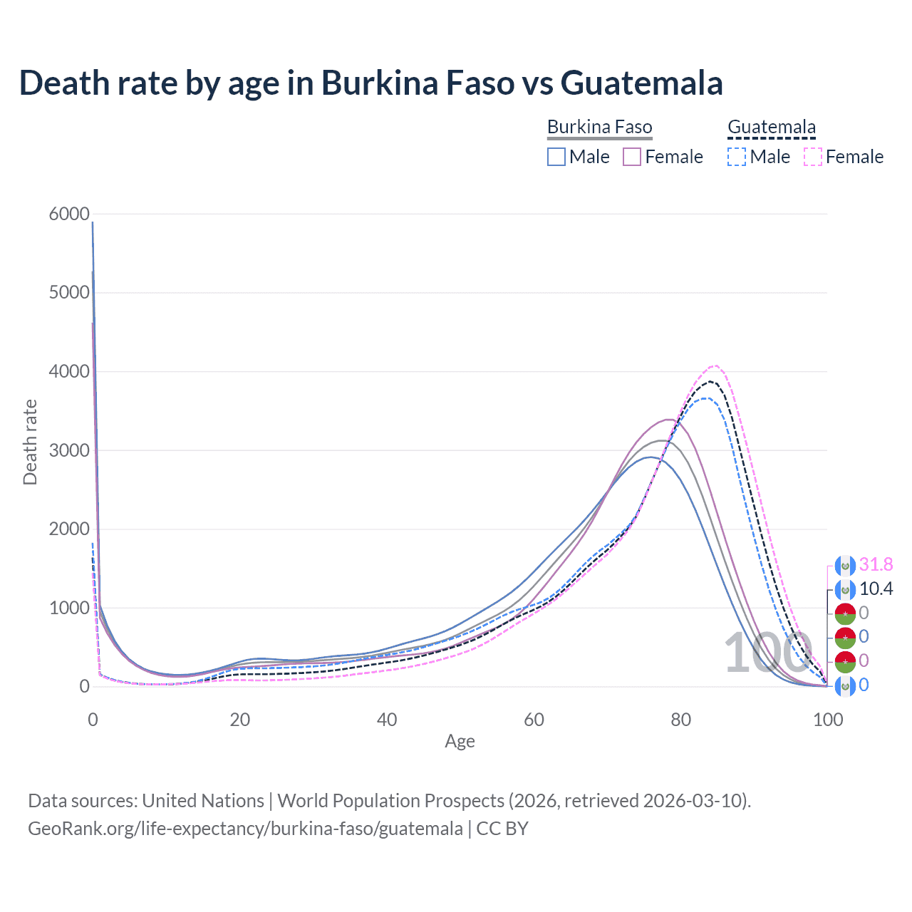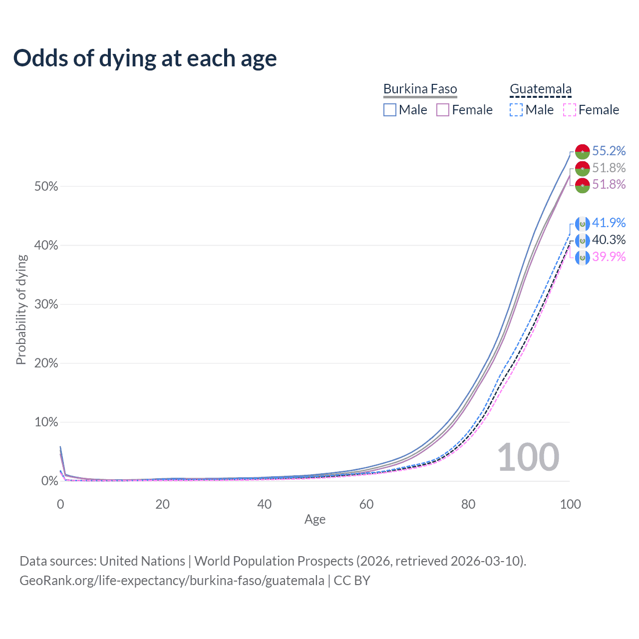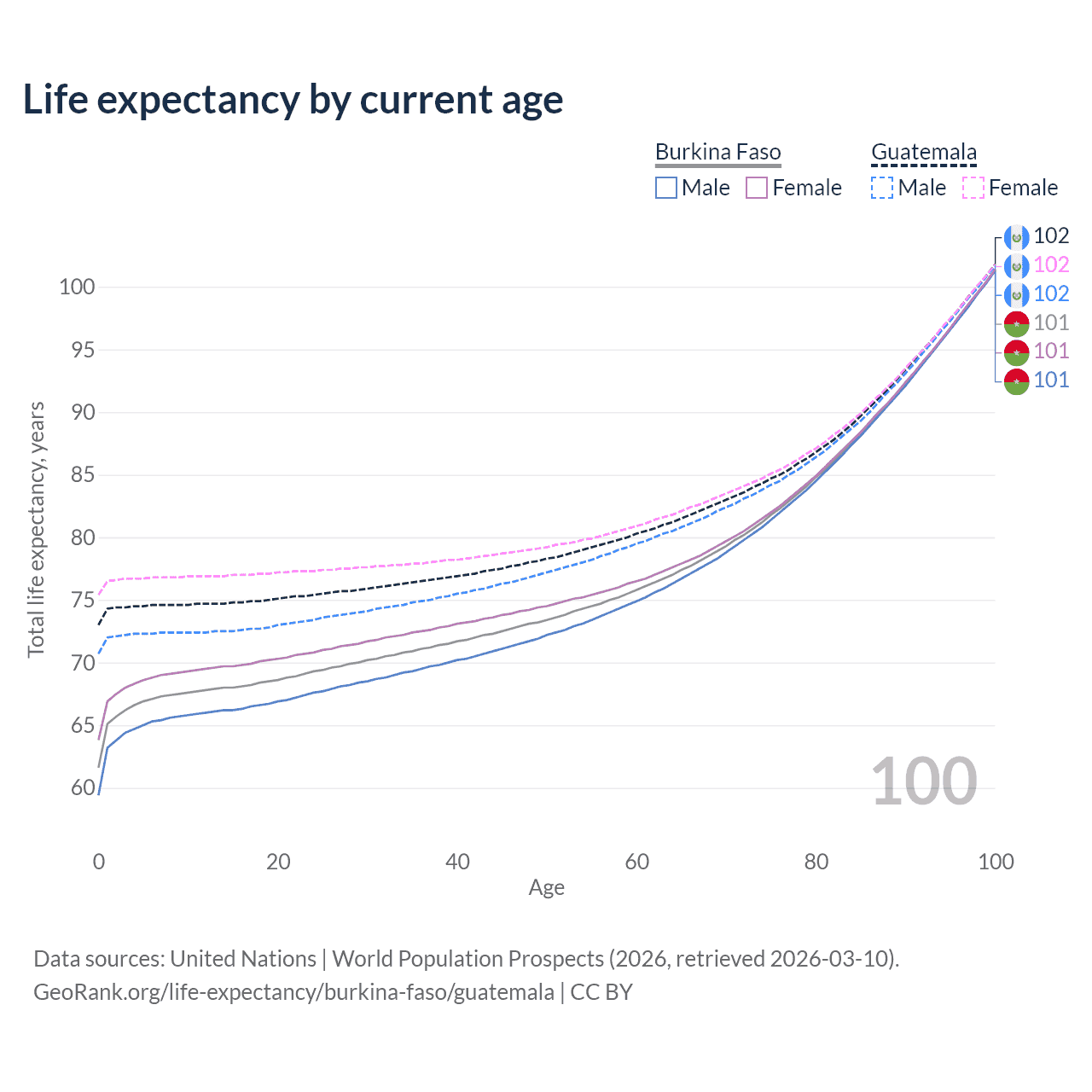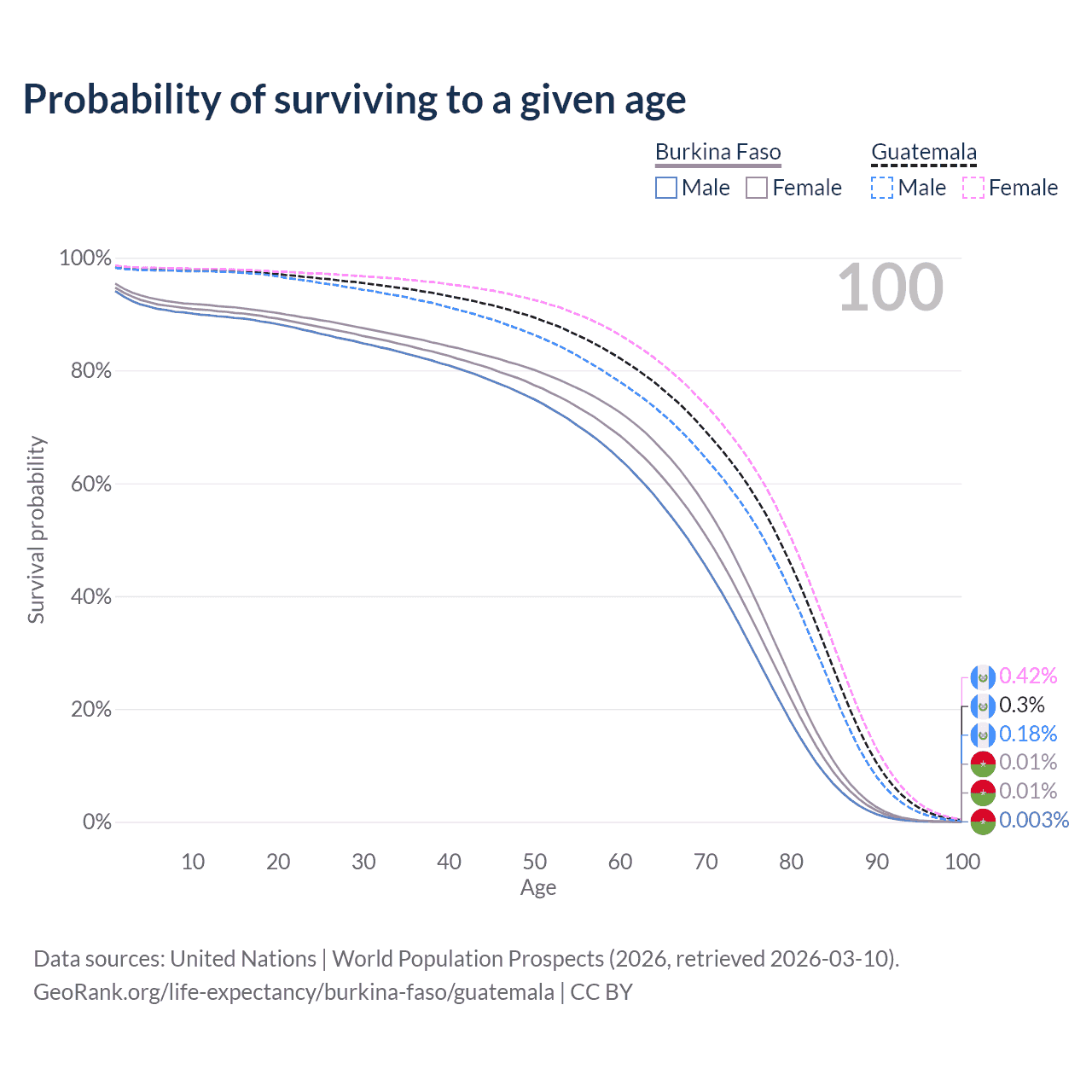 This life expectancy calculator shows the odds of living to 100, 95, 90, and below based on current age for both males and females in Burkina Faso and Guatemala, along with mean and median age of death. The calculations are based on the 2026 life tables (actuarial tables) from the UN World Population Prospects.