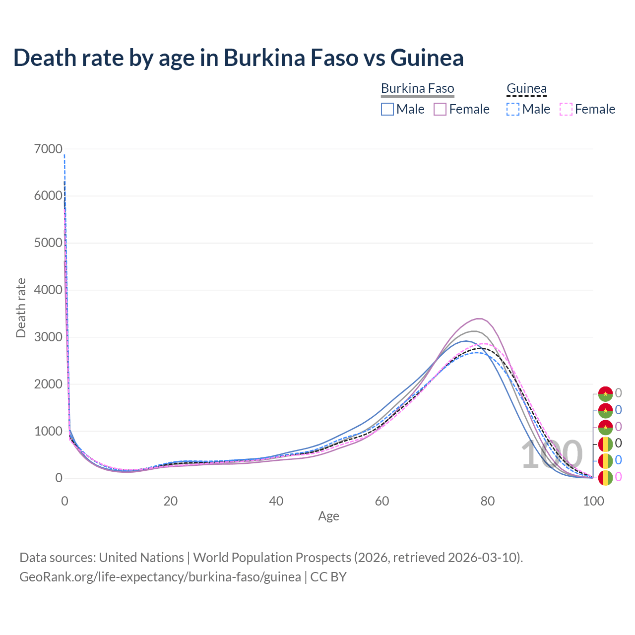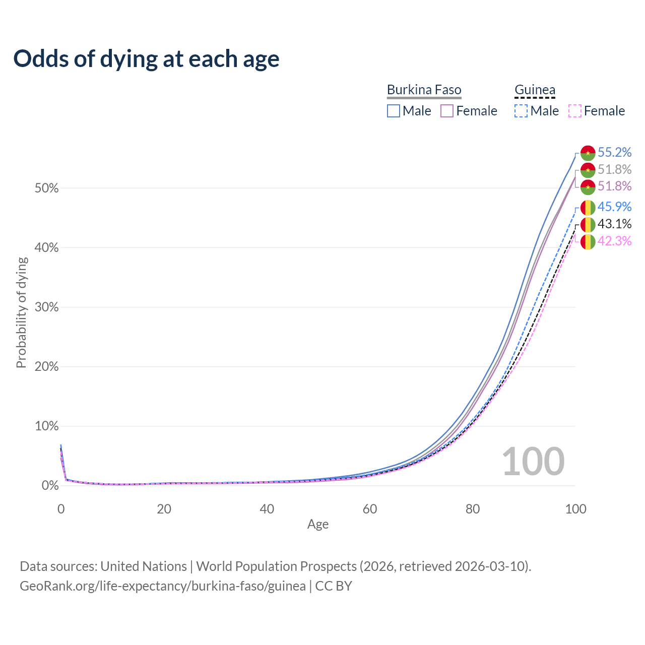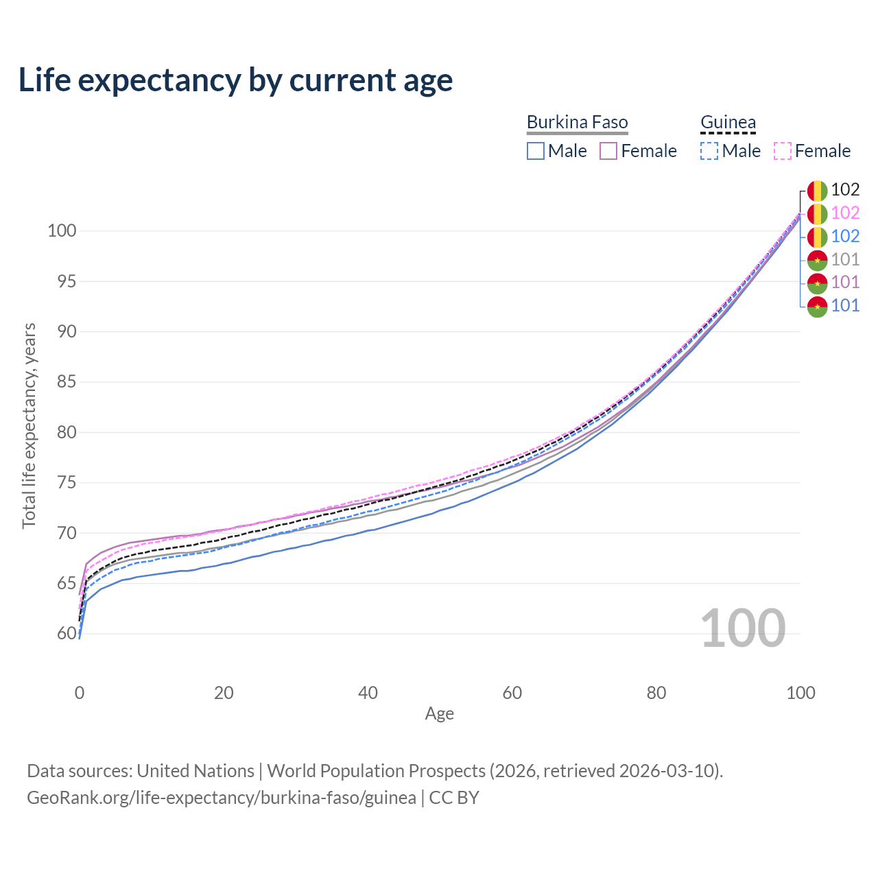 This life expectancy calculator shows the odds of living to 100, 95, 90, and below based on current age for both males and females in Burkina Faso and Guinea, along with mean and median age of death. The calculations are based on the 2026 life tables (actuarial tables) from the UN World Population Prospects.