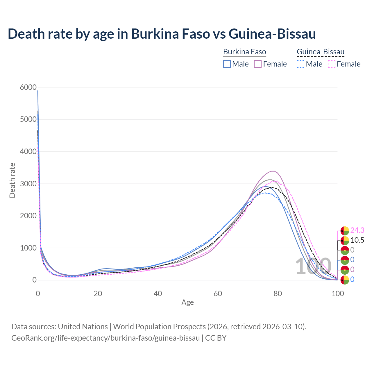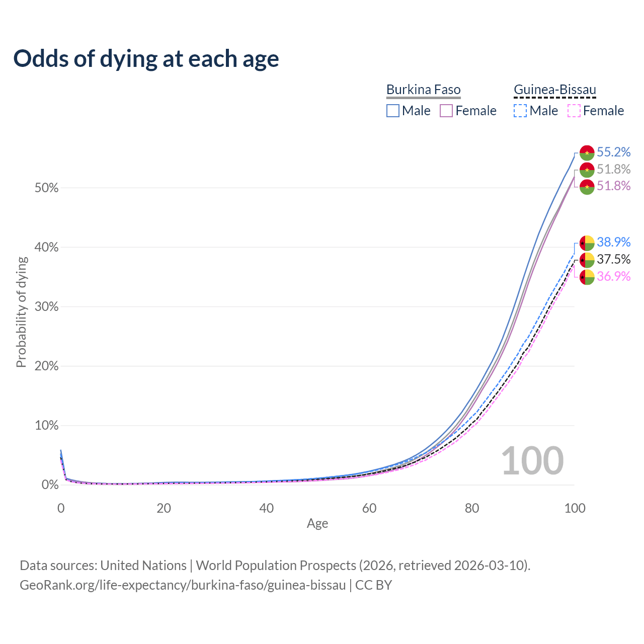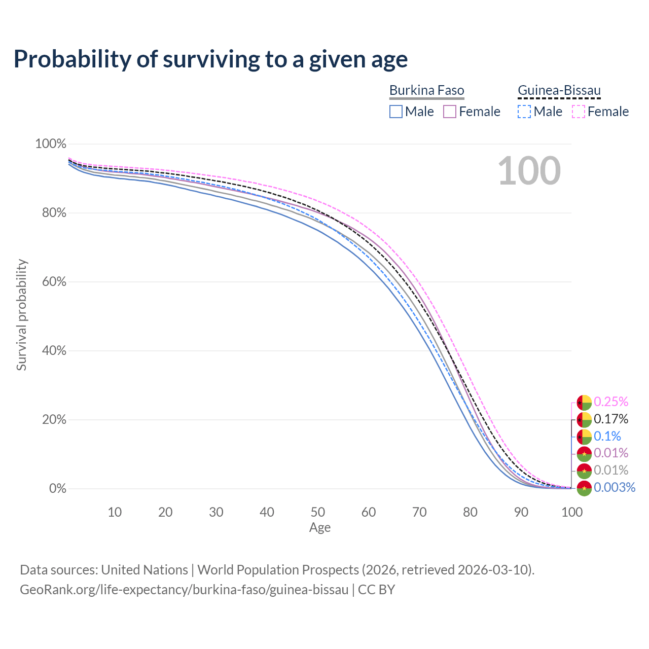 This life expectancy calculator shows the odds of living to 100, 95, 90, and below based on current age for both males and females in Burkina Faso and Guinea-Bissau, along with mean and median age of death. The calculations are based on the 2026 life tables (actuarial tables) from the UN World Population Prospects.